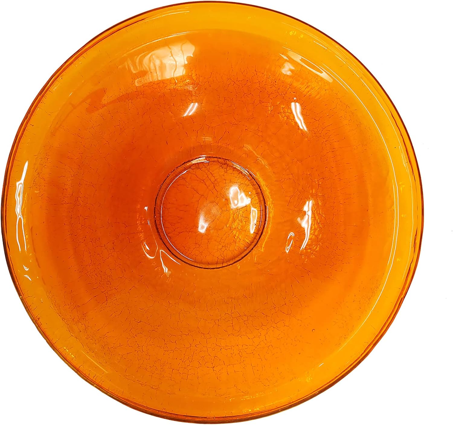 This brilliant Mandarin Orange Crackle Glass Bowl with a wrought iron Short Stand is striking as a low birdbath, or table centerpiece. Place it on a deck or table, a pedestal in the garden. The small three-footed wrought iron stand is perfect for rock gardens, low border plantings and tabletop decor. Fill it with floating flowers and candles for catering and garden parties.