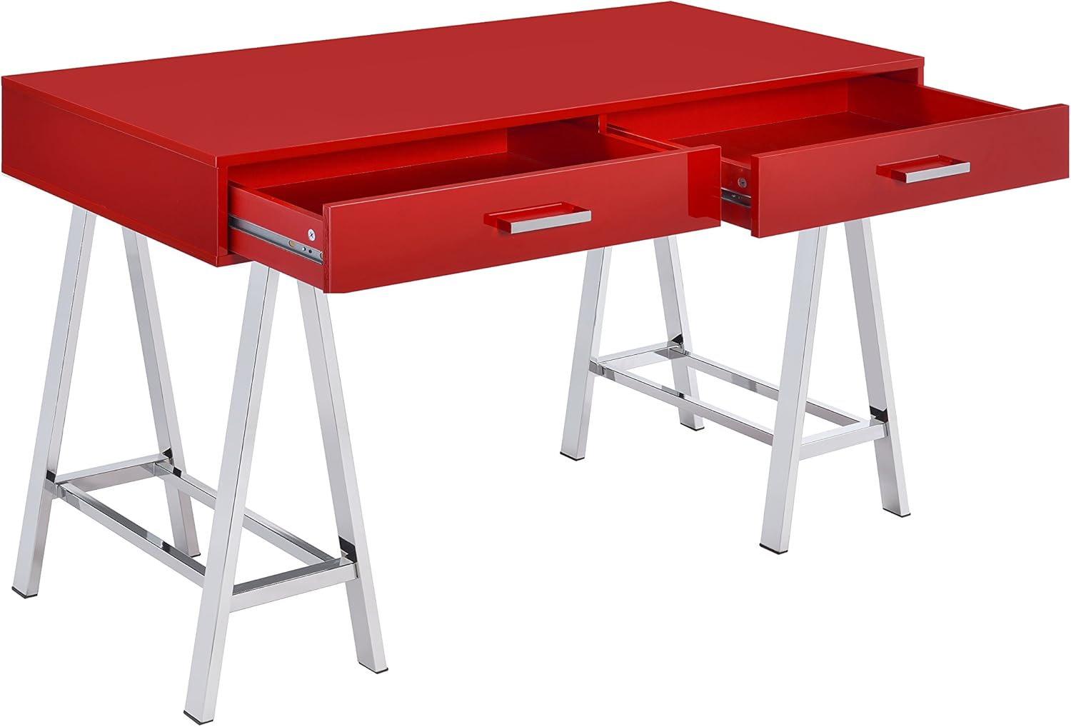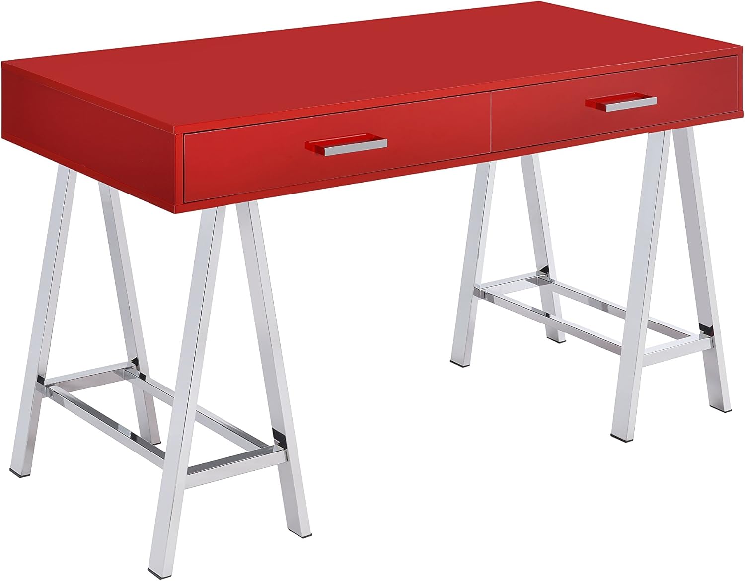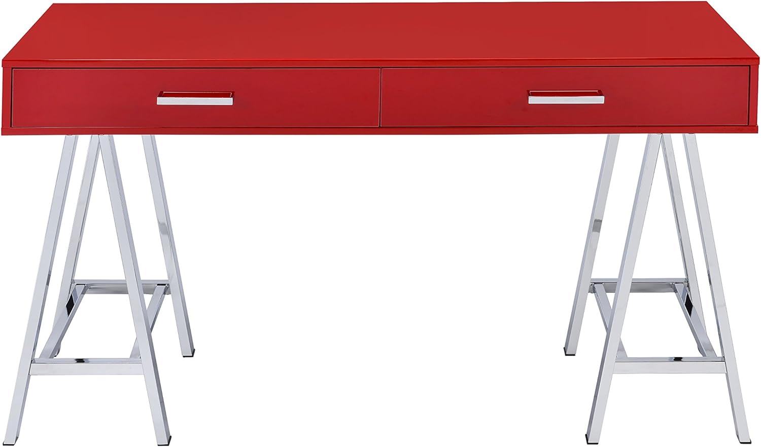 Bring a touch of modern into your home with the coleen desk, with its high gloss finished top with 2 drawers. It will serve as the perfect place to hold all of your often used supplies. The base is made up of 2 "Sawhorse" designed legs finished in chrome to emphasize this modern task desk. Offered in 3 desk top colors white , red, and Black.