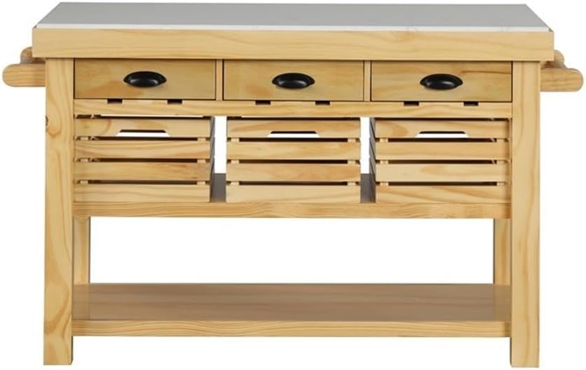 A versatile and stylish kitchen island is always a good investment for your home. A natural finish used on the wooden frame keeps the piece's overall appeal graceful. The wood frame is top with a rectangular marble table top in white that offers a modern appearance and kitchen space. It's built with three storage drawers, three pull-out baskets, towel racks, and open compartments that stow household or kitchen utensils within easy reach of your cooking area for efficient food preparation.