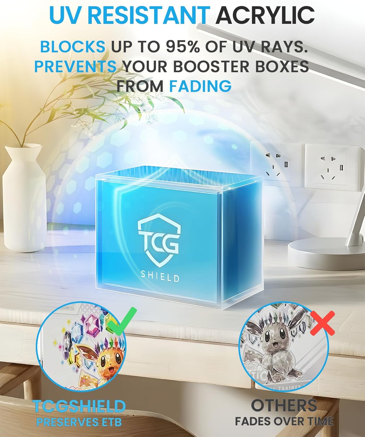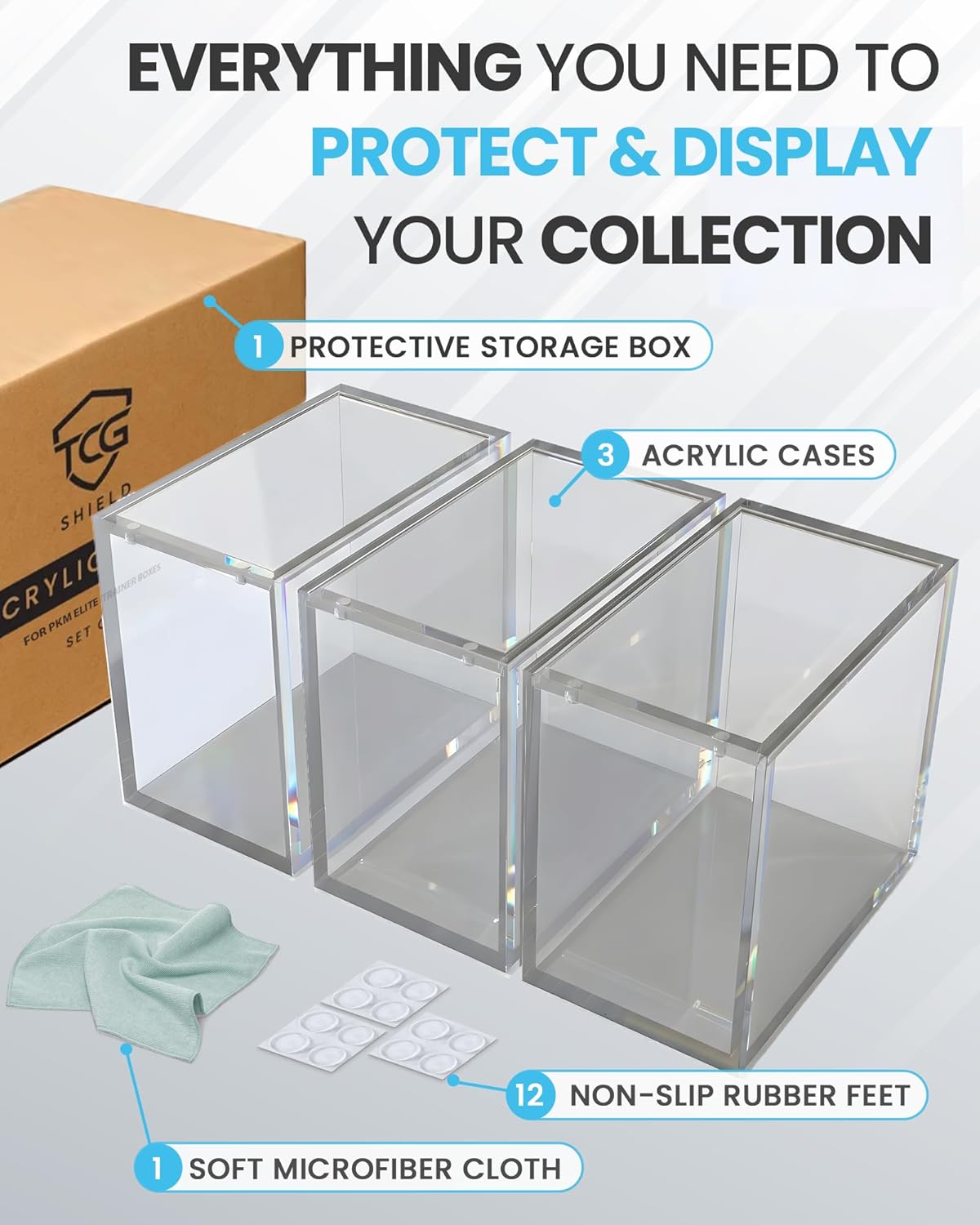 Preserve and display your Elite Trainer Box with confidence. TCGShield Acrylic Cases are engineered for collectors who demand both protection and presentation. Each Elite Trainer Box case is precisely measured to fit your ETBs —never too tight to risk seal damage, and never too loose to allow internal movement. Unlike other cases that pop open or drop lids when moved, TCGShield’s magnetic sliding lid uses dual N52-grade magnets to stay locked in place while still gliding open effortlessly for easy access. Constructed from 8mm and 5mm thick crystal-clear acrylic, these cases deliver exceptional clarity and protection against dust, drops, and moisture. Each 3-pack set includes three perfect fit booser box acrylic cases, 12 rubber feet for stability, a microfiber cloth for cleaning, and a protective storage box for safe transport and organization. Whether on a shelf, in a cabinet, or part of your display wall, TCGShield cases ensure your collection looks as impressive as it is protected. TCGShield. Built to Protect. Made to Display.