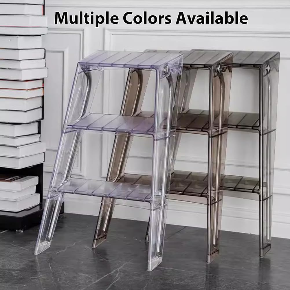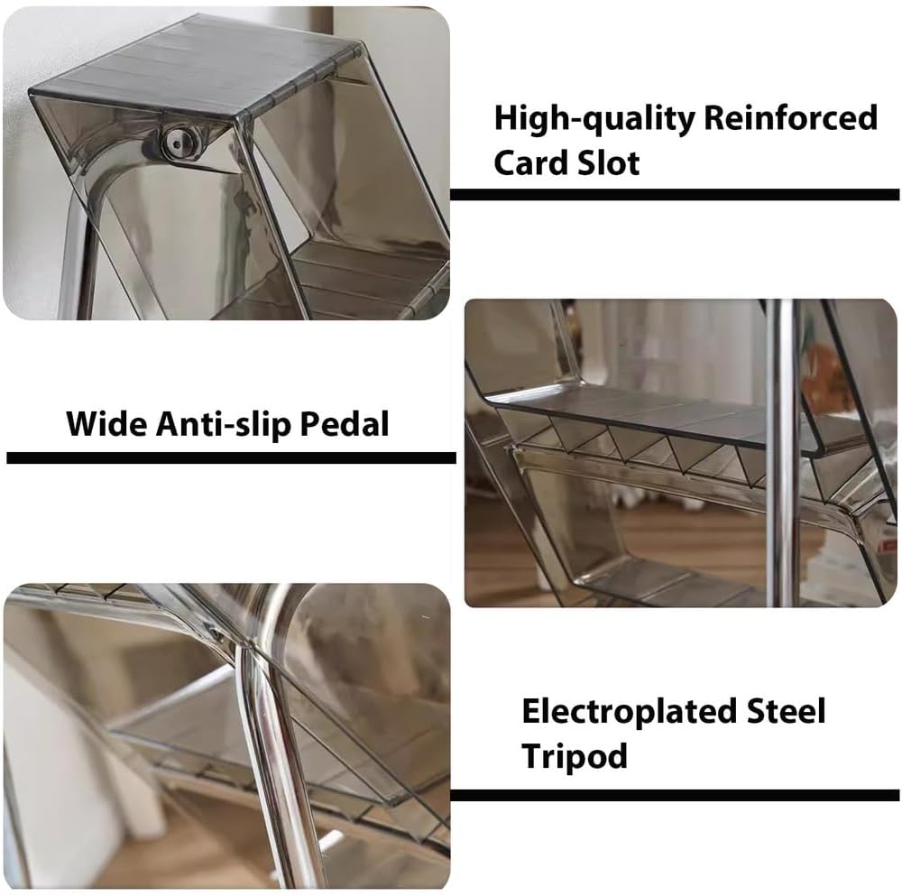 2-In-1 Design Folding Step StoolPremium Material: It is made of PC and metal material, with an electroplating process, which is stable, wear-resistant, impact-resistant, and not easy to deform, ensuring a long service life.Anti-slip Feet: They can keep the product more stable and prevent the floor from being scratched.Smooth Edges: They enhance the beauty of the product and better care for your skin when using and cleaning it.Simple Clean-up: It has a smooth surface and a simple structure, so you only need to wipe the dust with a towel.Name: 3 Step Folding Step StoolMaterial: Acrylic, Metal frameStyle: 3 Step LadderSize: 52x44x63cm (20.47x17.32x24.8 inch)Color:Transparent, gray, brownweight: 4.8kgApplication scenarios: home, office, library, kitchen, balcony, garden, etc.Included:1 x folding footstoolTips:1. Due to manual measurement, there may be slight deviations in the size of the Step Ladder2. The color of the step ladder shows a little deviation under different lights and displays, but it will not be very different