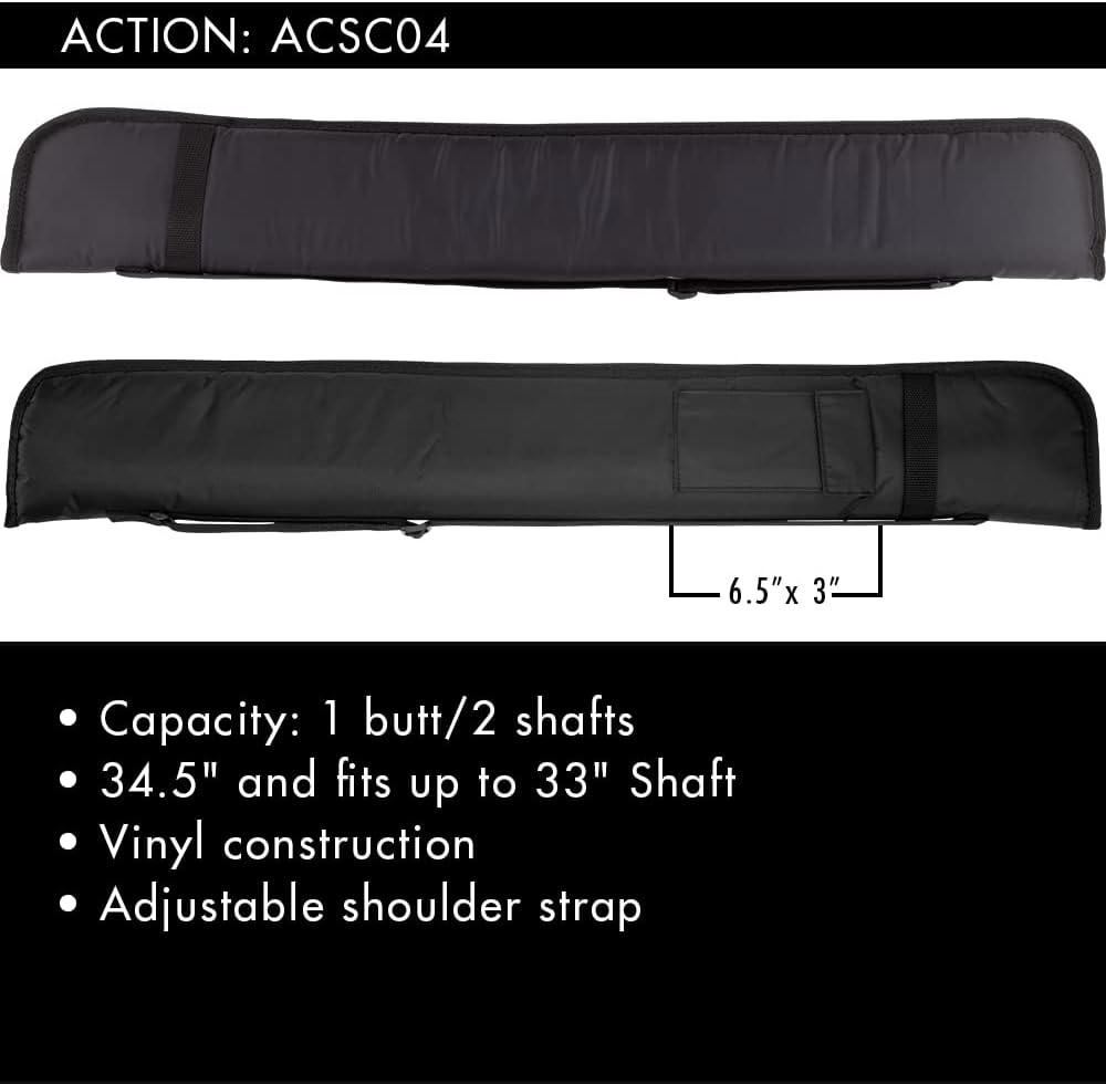 Product Description 1 butt and 1 shaft nylon soft case. Spacious pocket and shoulder strap. Pockets: 1 6 inch zip top pocket. Lining: Black faux fur with foam padding. Sleeves: Protection and separation between shafts and butt. Direction: Shaft and butt can be inserted in either direction. Length: Exterior length of 34 Inch, Interior will hold a shaft or butt up to 33 Inch. From the Manufacturer 1 butt and 1 shaft nylon soft case. Spacious pocket and shoulder strap. Pockets: 1 6 inch zip top pocket. Lining: Black faux fur with foam padding. Sleeves: Protection and separation between shafts and butt. Direction: Shaft and butt can be inserted in either direction. Length: Exterior length of 34 Inch, Interior will hold a shaft or butt up to 33 Inch.