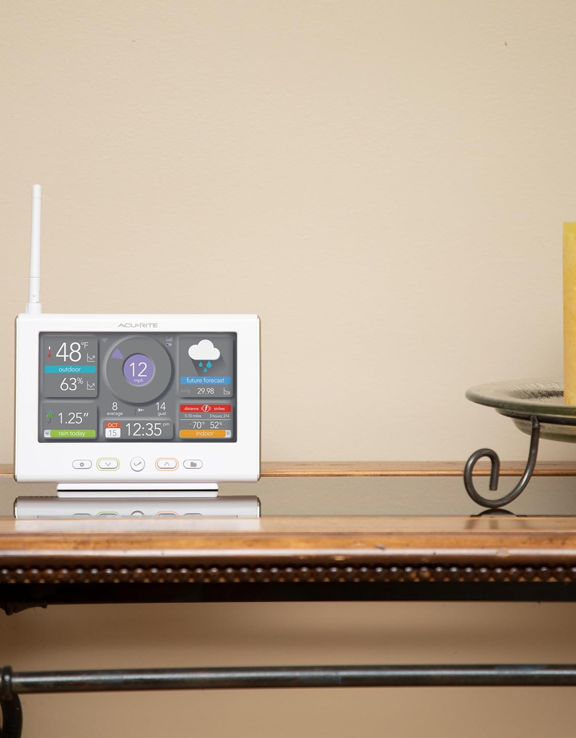 The AcuRite Iris Direct-to-Wi-Fi Weather Station provides you with hyperlocal weather information at your fingertips for home, office, or business use. Named as the Best Overall Weather Station for 2023 by Outdoor Life Magazine, this professional home weather station with built-in barometer allows you to monitor your backyard weather conditions from anywhere, anytime. Protect your family, house, and garden with minute-by-minute updates in weather changes, including outdoor temperature, humidity, wind speed/direction, rainfall, and lightning. Plus, the display measures indoor temperature, humidity, and barometric pressure. Smart and connected, the AcuRite Iris provides data right to your phone, tablet, computer browser, or to the Direct-to-Wi-Fi HD Display. The included uninterruptible power base provides power to your HD displays in case of a power outage. This power base will power your HD display for up to 6 hours after a power disruption, saving your settings and historical records. The digital display connects to your 2.4 GHz Wi-Fi network for easy viewing anywhere inside your home, office, or business. This weather station comes with a one-year limited warranty.