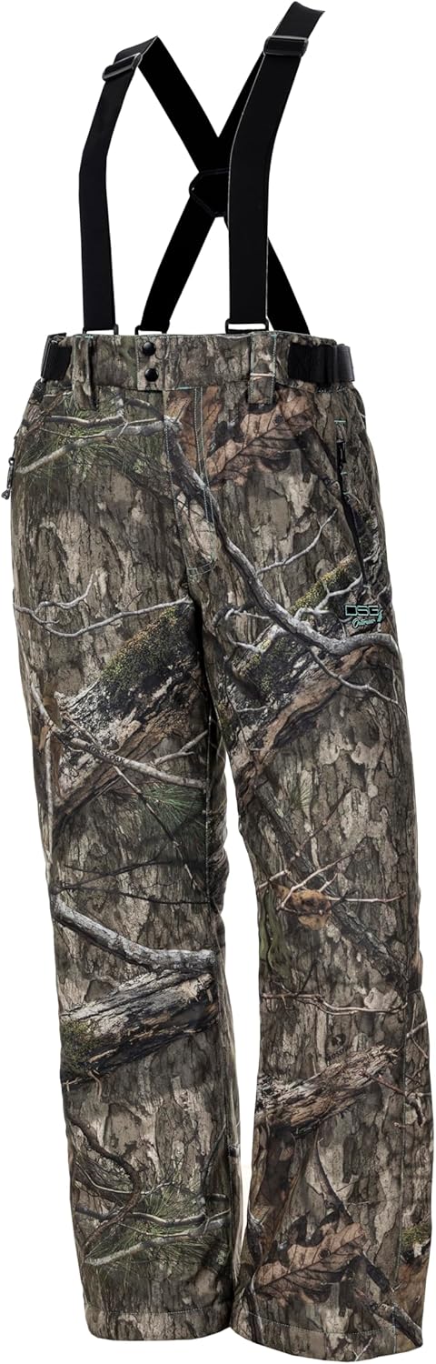 The Addie Bib/Pant is a hushed, brushed waterproof/windproof pant with fixed insulation, available in Realtree Edge, Blaze Pink, and Blaze Orange. The Realtree Edge camo pant features fully taped seams with DWR treatment to repel water. Removable suspenders can be converted to pants, with DWR treatment on the fabric's face to shed water. It's windproof/waterproof with fully taped seams, offering a thin profile with 120 gram polyfill insulation. The inseam is adjustable from 32.5" to 28.5" with heavy-duty side leg zippers. These camo hunting pants have side hand warmer pockets and are designed for women with adjustable waist tabs and suspenders.