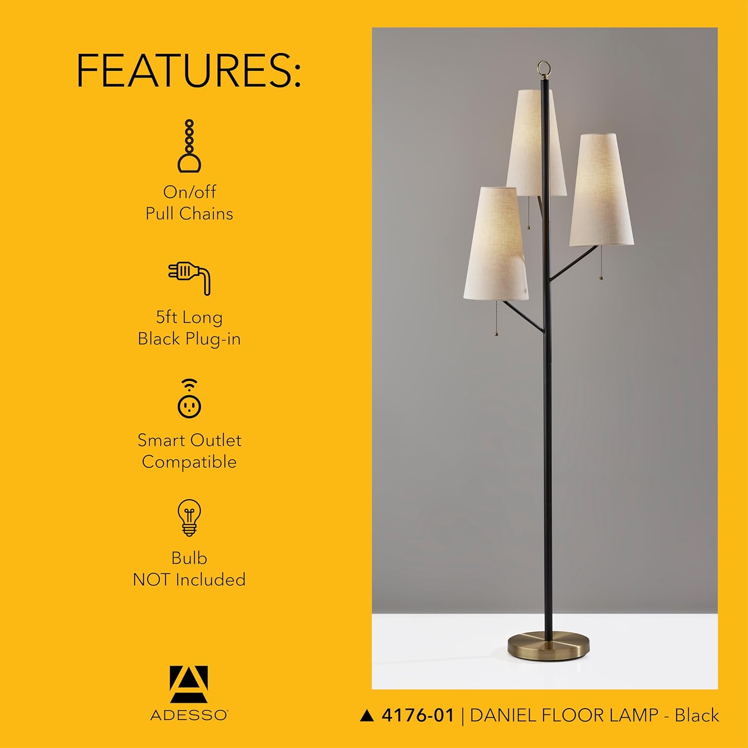 Brighten your room with a modern, industrial flair with the 71 Daniel floor lamp. The clean silhouette, large offset shades, and combination of black and antique brass finishes create an understated yet stylish look. The lamp features a black metal body, with coordinating antique brass finish on the base and top. Three arms present linear lines at offset heights leading to tall cream textured fabric shades. Each light is operated by a pull chain to easily turn the 40W bulbs (not included) on or off independently of each other, and the floor lamp features a black 5' cord. Complete your interior design with the matching Daniel table lamp.