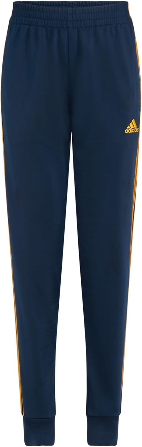 The core tricot jogger features draw cord at waist band, on seam pockets and rib cuffs. Applied stripes Embroidered linear Adidas brand mark on left leg. Fit guide - Without shoes, stand child with feet slightly apart and their backs to the wall. Measure from the floor to the top of their head for height