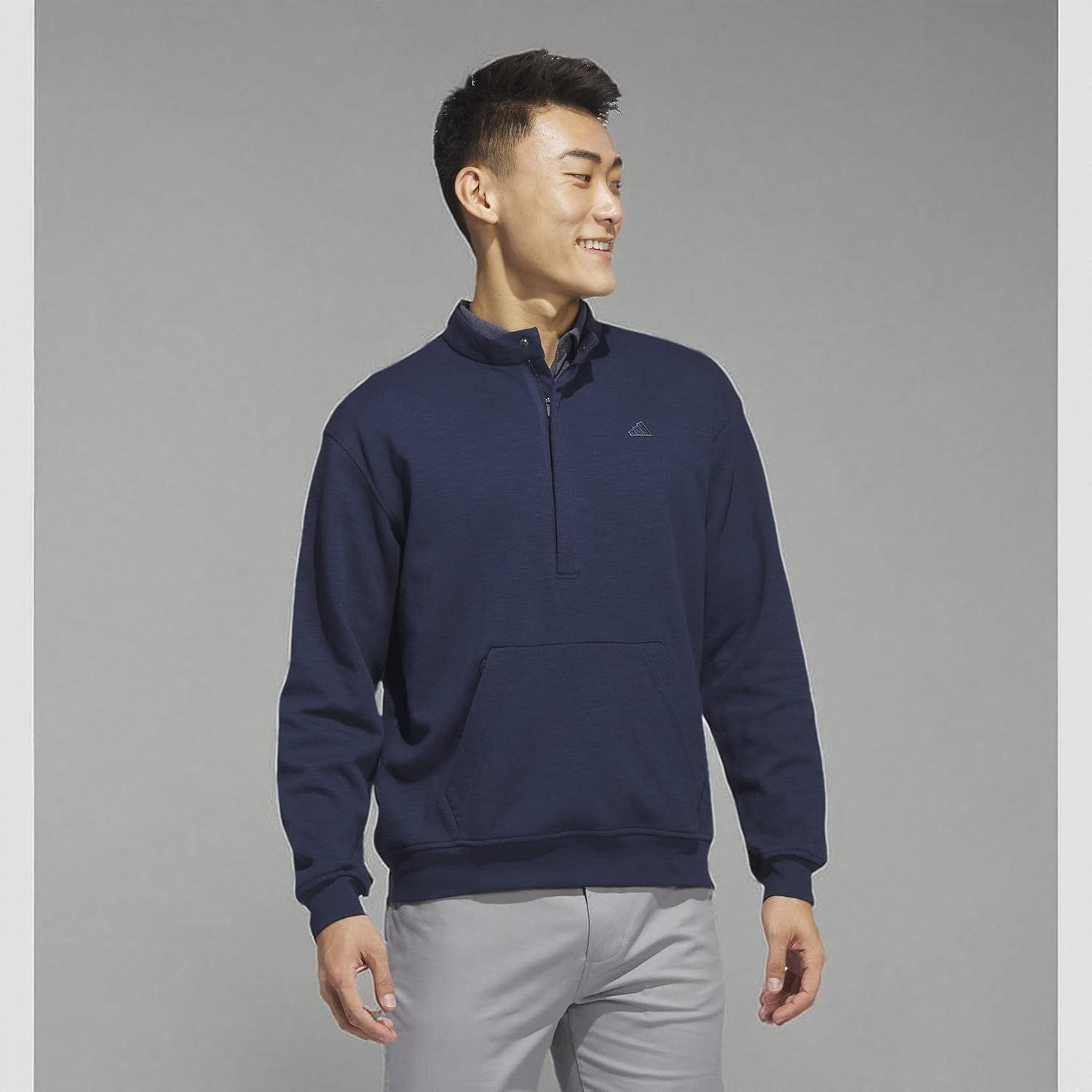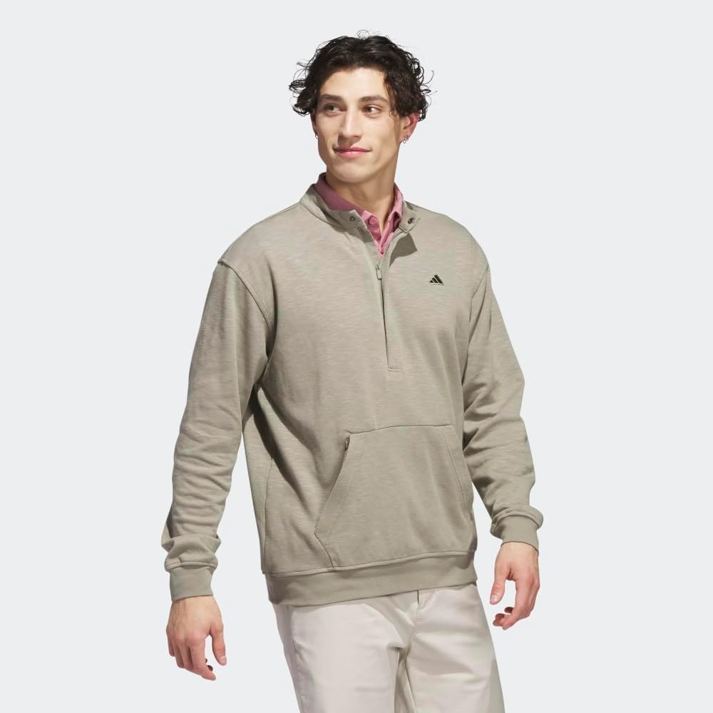 Play through cool weather in cozy comfort. This men's adidas golf sweatshirt is made of a cotton blend that gives it a super-soft feel. A kangaroo pocket warms hands between shots. The hidden half-zip design with a low collar finishes the look. Our cotton products support more sustainable cotton farming.