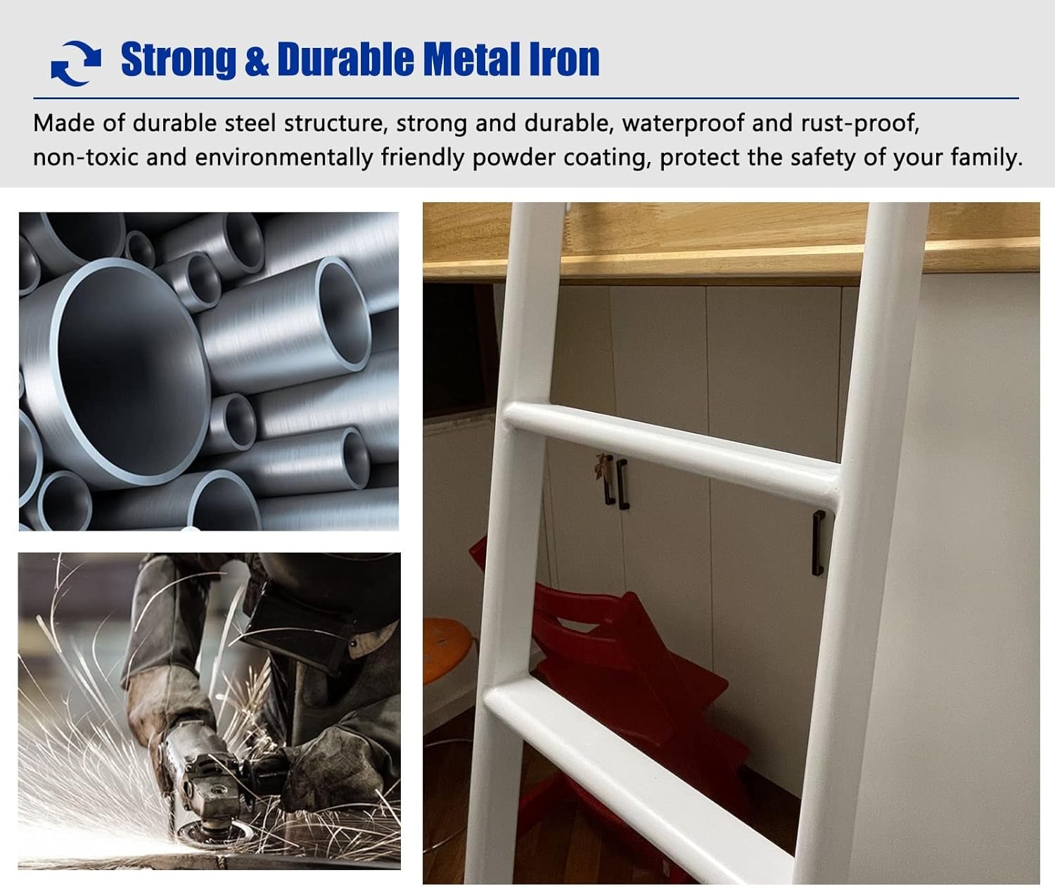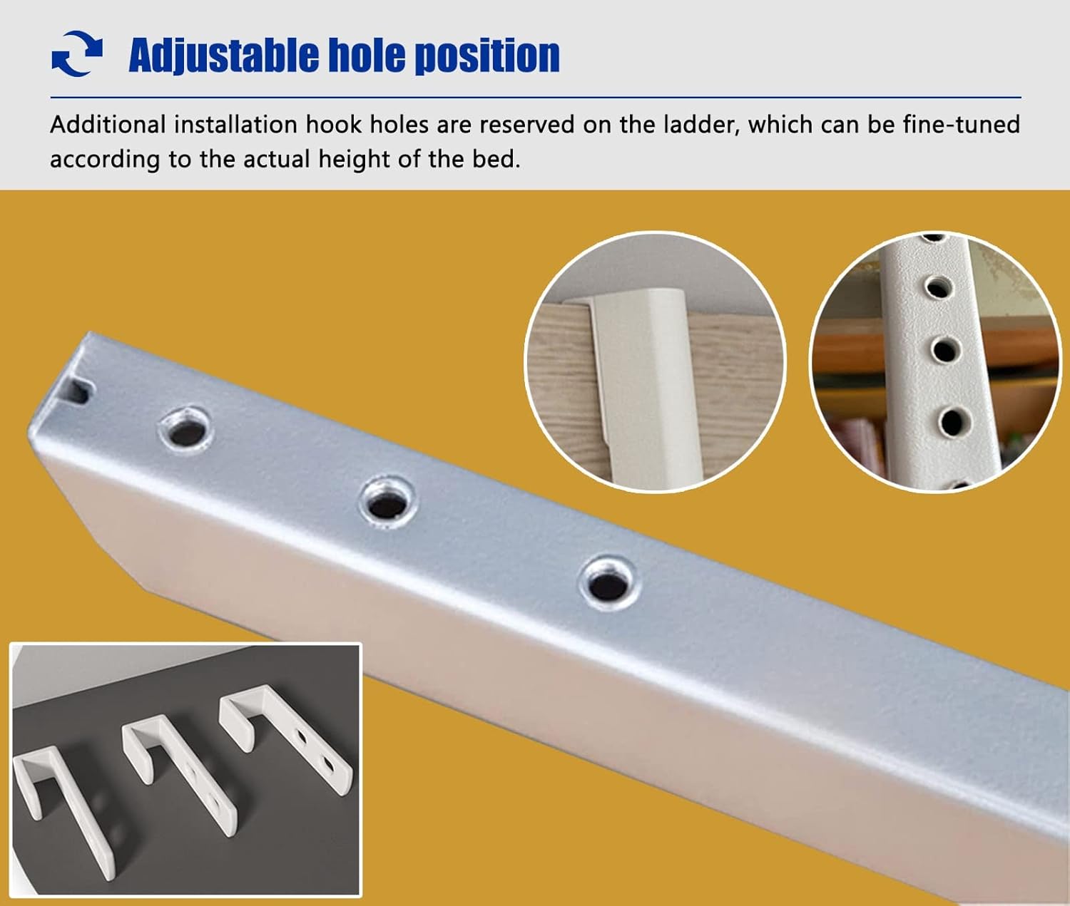 Introducing our versatile bunk bed ladder, designed to provide children and teens with easy access to their sleeping space while maximizing floor area in your home, RV, or campsite. This ladder is the perfect accessory for bunk beds, ensuring safety and convenience without the bulky presence of permanent stairs. **Specifins:** - **Material:** Sturdy steel - **Optional Sizes:** - 4 Steps: 13.39" x 45.67" - 4 Steps: 13.39" x 51.18" - 4 Steps: 13.39" x 55.12" - 5 Steps: 13.39" x 59.06" - **Overall Width:** 13.39" - **Weight Capacity:** 330 lbs **Features:** - **Robust Construction:** Crafted from durable steel for stability and long-lasting use, resistant to rust. - **Safety First:** Rounded and smooth edges ensure a comfortable climbing experience. - **Portable Design:** Lightweight and easy to install, this ladder does not occupy floor space, making it ideal for compact living areas. - **Adjustable Hooks:** Multiple mounting holes allow for customized height adjustments according to your needs. - **Multi-Purpose Use:** Not only suitable for bunk beds, but this ladder also serves as a loft ladder, making it a versatile addition to your home. **Package Includes:** - 1 x Bunk Bed Ladder (including all mounting accessories) **Warm Reminder:** If you need different sizes or colors, feel free to contact us for personalized options. Please note that due to monitor differences and lighting conditions, there may be slight color variations between the images and the actual product. **Customer Service:** Should you have any questions regarding the product, our dedicated customer service team is available 24/7 to assist you. Providing efficient and reliable service is our commitment to you. Choose our bunk bed ladder for a safe, space-saving solution that enhances your living experience!