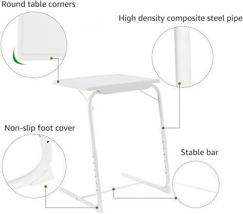 Elevate Your Comfort with the Versatile Folding TV Tray Table Discover the ultimate in convenience and functionality with our Folding TV Tray Table, designed for the modern lifestyle. This versatile tray table features a durable construction using medical-grade HDPE plastic and robust steel framing, ensuring a waterproof and warp-resistant surface that stands up to daily use and spills. Tailored Flexibility for Every Need Adjustable across 6 height levels (21.7 to 28.7 inches) and featuring 3 tilt angles (up to 30°), this tray table is perfect for various activities—whether you're enjoying a meal, working from home, or reading in bed. The spacious 20.5 x 15.7 inch top accommodates laptops, dinner plates, and books comfortably, while the built-in cup holder keeps your drinks secure and within reach. Engineered for Stability and Easy Use With non-slip feet, this folding table stays firmly in place on any surface, preventing unwanted shifts during use. Its L-shaped legs conveniently tuck under furniture, making it a great fit for couches, beds, or other tight spaces. When it's time to tidy up, simply fold it flat and slide it under your sofa for effortless storage. Beyond Ordinary Utility This Folding TV Tray Table is more than just a table; it’s a versatile solution for various scenarios. Whether you need a breakfast tray in bed or an extra workspace next to the sofa, its 66 lbs capacity meets your needs. Ideal for families, students, and professionals alike, it enhances comfort and organization in any living space. Specifications: - Material: HDPE Desktop + Composite Steel Frame - Size: 20.5 L x 15.7 W inches - Height Range: 21.7 – 28.7 inches - Tilt: 0° – 30° - Weight Capacity: 66 lbs - Color: White Transform your relaxation and productivity today—this Folding TV Tray Table brings convenience and comfort to your everyday life!