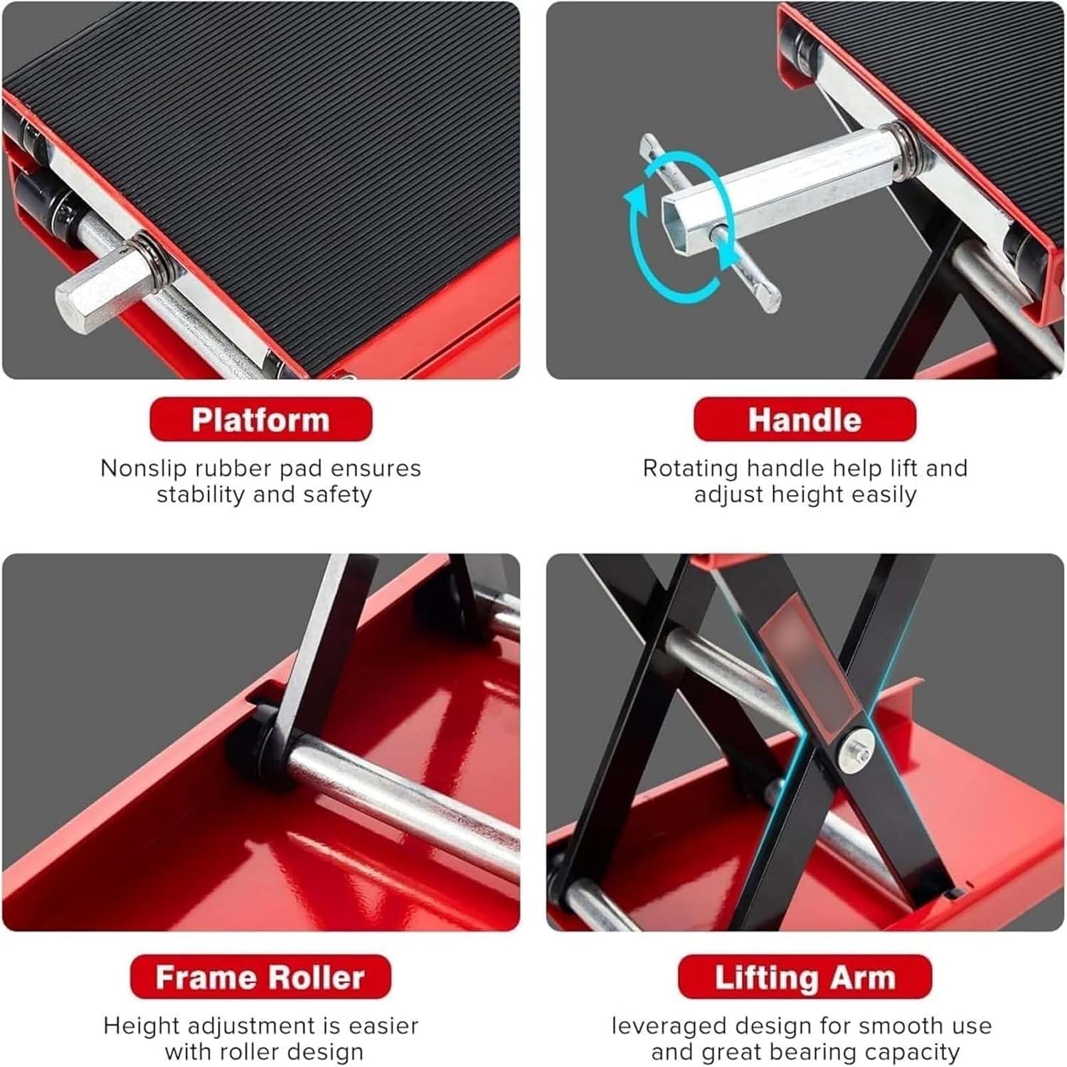 The Motorcycle Jack Lift is designed for durability and performance, constructed from high-quality steel to ensure longevity and reliability. With a substantial load-bearing capacity of 500kg, it is capable of lifting a wide range of motorcycles, including standard, cruiser, touring, and sports bikes. The lift features a minimum height of 8.5cm and extends to a maximum height of 34cm, providing versatility for various lifting needs. Its platform size measures 36*22cm, offering a stable and secure base for your motorcycle. Weighing 13kg, it is both sturdy and manageable. Each purchase includes Motorcycle Jack Lift. Please note: The actual color of the item may vary slightly from the images due to display and photographic lighting conditions. Additionally, there may be minor size discrepancies due to manual measurement; we recommend referring to the actual product received for precise dimensions. The scissor lift's wide, flat platform ensures stable bike positioning and safe working conditions, making it an essential tool for motorcycle maintenance and repair.