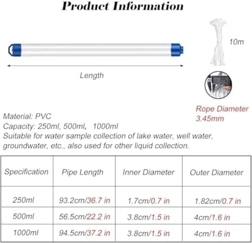 Introducing our versatile Water Sampler, designed for seamless collection of various water samples including sewage pipeline wastewater, pipeline flowline water, lake water, well water, groundwater, and near-shore river water. With options available in 250 ML, 500 ML, and 1000 ML sizes, this sampler is ideal for both personal and professional use. Crafted from durable PVC material, our Water Sampler features a strong sealing mechanism that ensures reliable sample integrity. The smooth tube wall allows for rapid sampling, while the lightweight design provides ease of use in any setting. The high transparency of the sampling tube maximizes the authenticity of each sample, giving you confidence in your water quality assessments. The innovative water stopper ball effectively prevents samples from flowing out, ensuring that you capture the exact amount needed for analysis. To use, simply tie a rope to the upper end of the sampler, lower it into the water source, and allow the water to fill the tube. After waiting for 10 seconds at the desired depth, pull the sampler upward to seal the sample securely. This process is quick, efficient, and perfect for a range of applications, from environmental monitoring to personal water testing. Included in the package is one Water Sampling Dipper, making it easy to get started on your sampling tasks right away. Please note that due to manual measurements, slight variations in size may occur, and minor color differences may be present due to lighting conditions. Choose our Water Sampler for a reliable, effective solution for your water sampling needs, whether at home, in the field, or in research settings. Experience the difference in quality and convenience today!