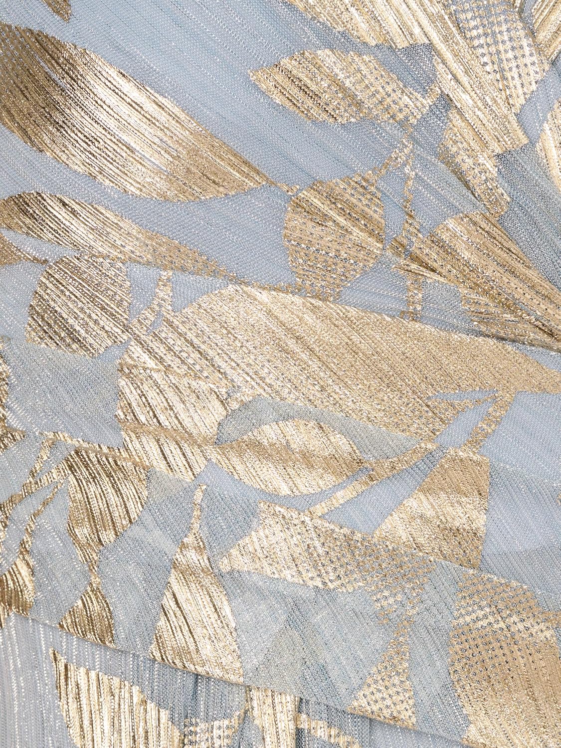 Natural details meet sparkle in this elegant draped gown. This formal dress features a v-neckline, surplice bodice, flutter short sleeves, and a floor-length soft skirt. Soft draping at the waist and skirt accentuates the wearer's figure. Crafted from crinkle foiled leaf fabric, thisevening gown shines on a formal or black-tie night out. A slit at the side of the skirt and a zipper closure at the center back completes this metallic dress. Styled with nude high heels and a contrast clutch, this short sleeve gown will be a hit on the red carpet.