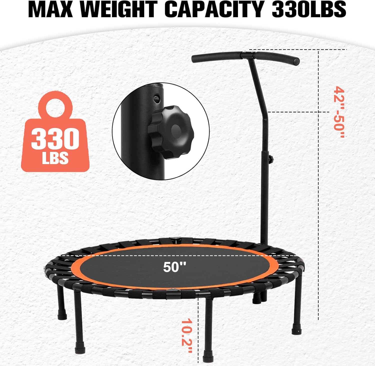 Introducing our ultimate adult trampoline with a U-shaped handle, your ticket to a fun and effective fitness journey! Boasting 42 thicken springs and thickened metal steel rings, this trampoline is your go-to for a safe and thrilling workout experience. Say bye-bye to boring workouts with 5 different height levels (31.5-41in), a comfy foam handle, and an adjustable knob for a customizable bounce session. But wait, there's more! Our trampoline cover wraps all springs with anti-slip rubber material, while the heavy-duty rubber leg holders ensure rock-solid stability. Bounce your way to toned muscles, sculpted legs, and improved posture in just 10 minutes – now that's efficient fitness! Plus, with noise-reducing features, this trampoline lets you jump to your heart's content without disturbing the peace. Foldable for easy storage and featuring an adjustable handle height (31.5''-41''), this trampoline is your versatile workout buddy. With a high weight capacity of 440lbs, it's built to support your fitness goals and keep you bouncing back for more joyful and rewarding workouts. Don't let gravity hold you down – jump into a healthier, happier you with our U-shaped handle trampoline today!