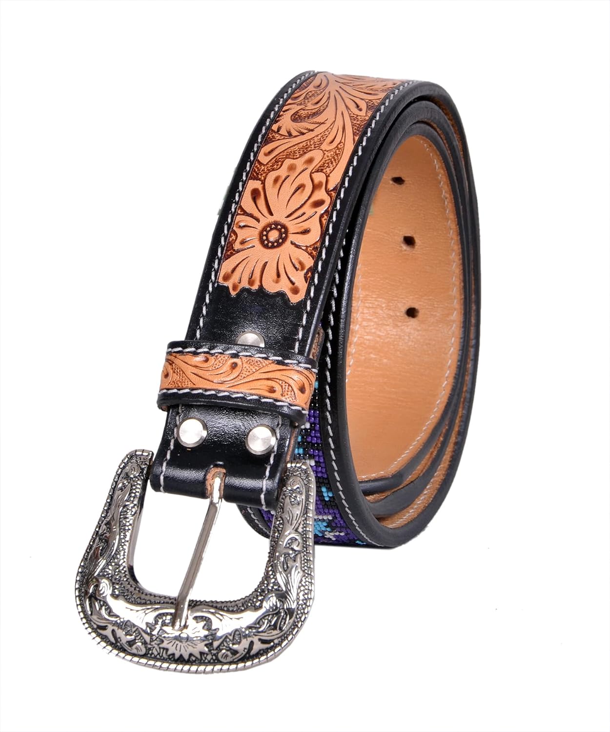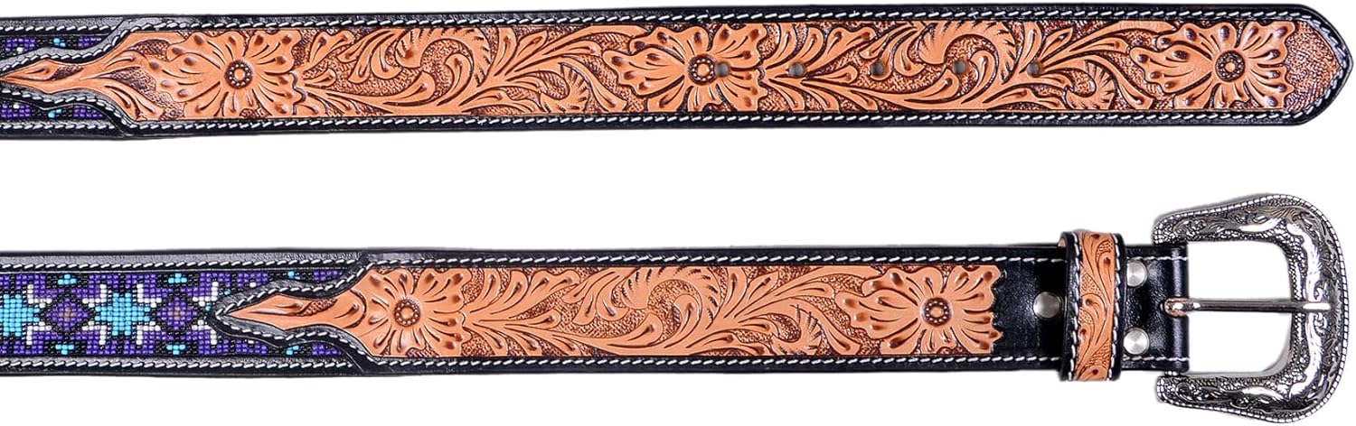 Handcrafted Western Beaded Leather Belt for Men & Women - Vintage Floral Tooled Design with Engraved Silver Buckle Enhance your outfit with this Western leather belt, designed for those who appreciate quality craftsmanship and classic cowboy style. This premium hand-tooled leather belt is made from genuine, full-grain leather, ensuring durability and comfort for long-lasting wear. The belt showcases an intricate floral tooling pattern, perfect for adding a touch of rustic charm to your wardrobe. The belt's ornate silver buckle features finely detailed engravings, giving it an authentic vintage Western look. The elegant two-tone design, with rich brown leather and contrasting black accents, is enhanced by striking white cutout details, making this belt a standout accessory for any outfit. This Western cowboy belt pairs perfectly with jeans, dress pants, or even dresses, making it versatile for country concerts, rodeo events, and everyday wear. Key Features: Premium Quality Leather: Made from high-grade, full-grain leather that’s built to last. Handcrafted Floral Tooling: Each belt is meticulously hand-tooled with a classic Western floral design. Ornate Silver Buckle: Vintage-style engraved buckle adds a touch of elegance and authenticity. Versatile Western Belt: Ideal for cowboy outfits, country fashion, and Western-themed events. Perfect for Men and Women: Unisex design that works great for both men's and women's fashion. Available in Various Sizes: Multiple size options for a comfortable fit. Great for: Western fashion enthusiasts looking for a stylish leather belt. Those in search of a rodeo belt, country concert belt, or an accessory for a Western-themed wedding. Everyday wear, whether dressing up jeans with a cowboy belt or accessorizing a casual dress. Care Instructions: To maintain the beauty of this leather belt, use leather conditioner periodically and avoid exposure to moisture.