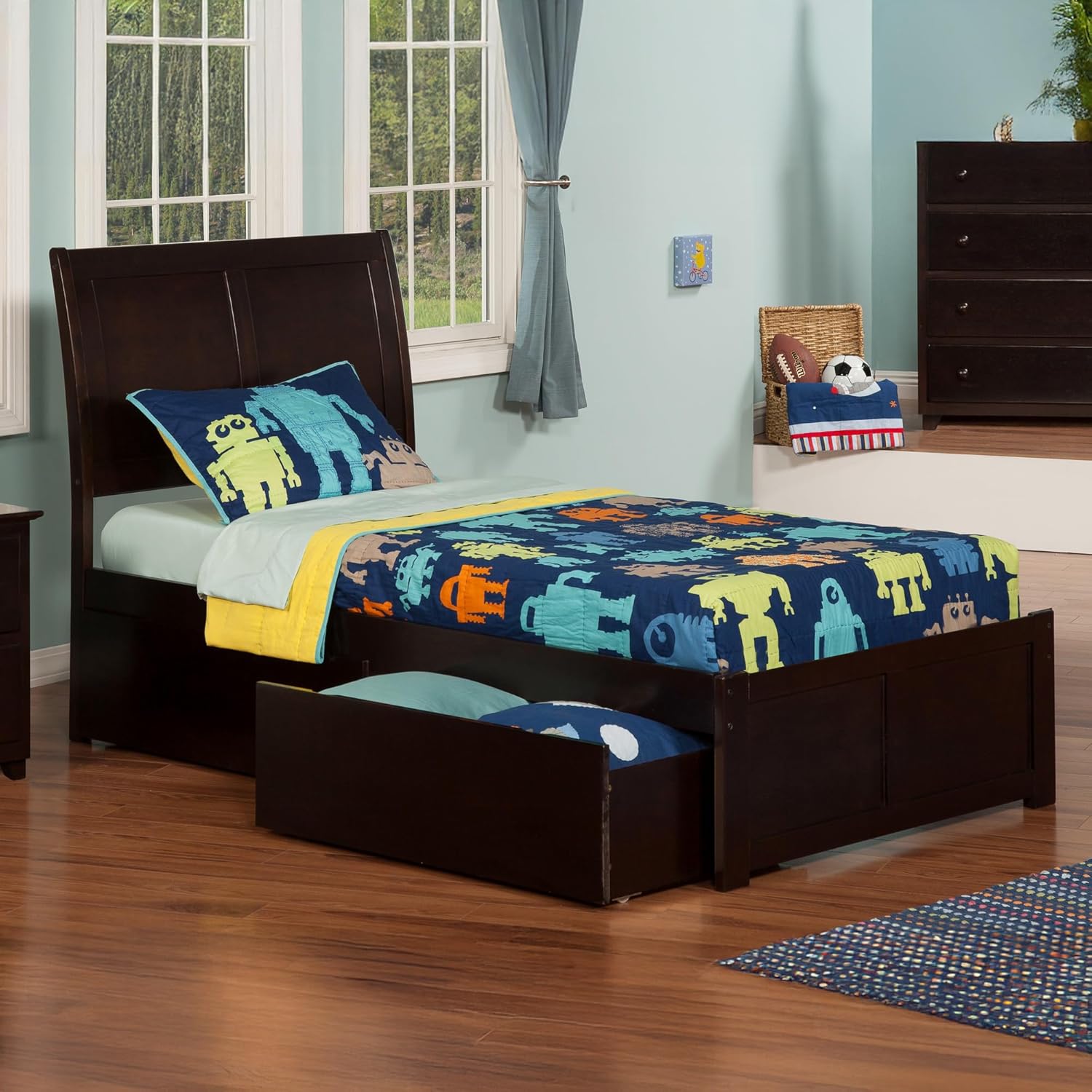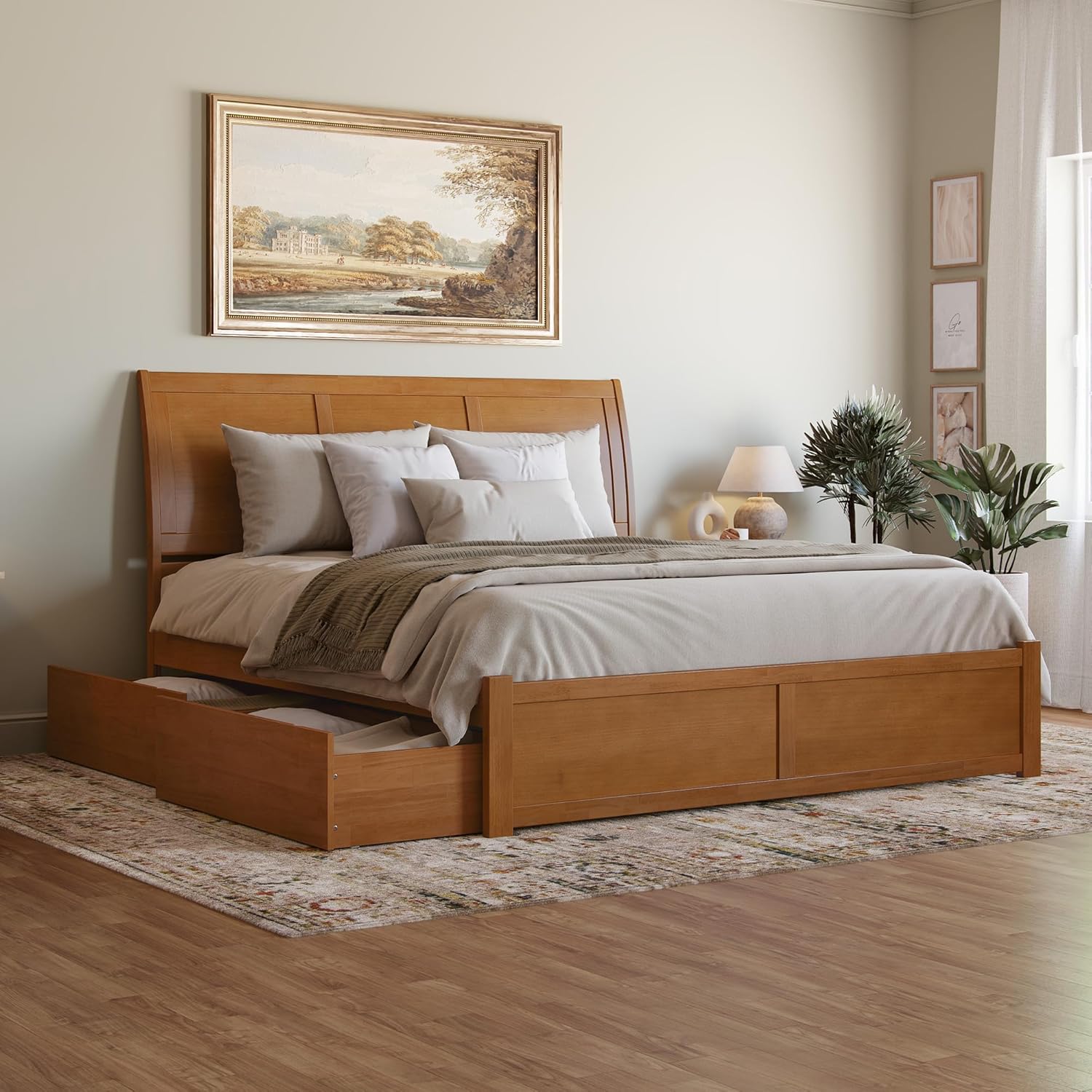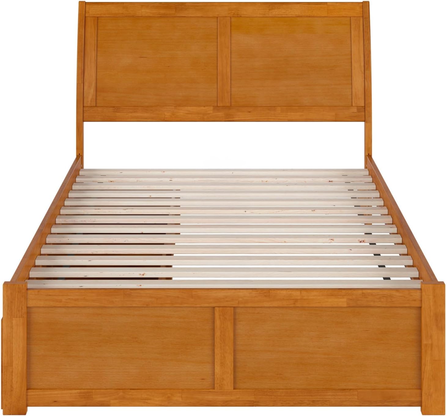 Elevate your bedroom with The Portland Solid Wood Platform Bed with Footboard and Set of 2 Storage Drawers, a true masterpiece of design and functionality. Crafted to perfection, this bed offers a blend of timeless elegance and modern comfort that will transform your sleep space. Boasting a stunning sleigh panel wood headboard, the Portland serves as a striking centerpiece, creating a warm and inviting atmosphere. Choose from a selection of beautiful colors, including Espresso, White, Walnut, and Light Toffee, allowing you to match your personal style and room decor seamlessly. With hassle-free assembly, thanks to the included slat kit, there's no need for a foundation or box spring. The Portland comes in a range of sizes, Twin XL, Twin, Full, Queen and King, ensuring the perfect fit for your space. Plus, it comes complete with a set of two underbed drawers, adding both convenience and style to your room. Experience the perfect blend of classic design and contemporary convenience with The Portland Solid Wood Platform Bed with Footboard and Set of 2 Storage Drawers – a stylish addition that offers durability and optimal mattress support for a restful night's sleep.