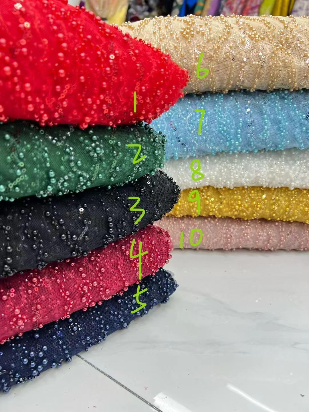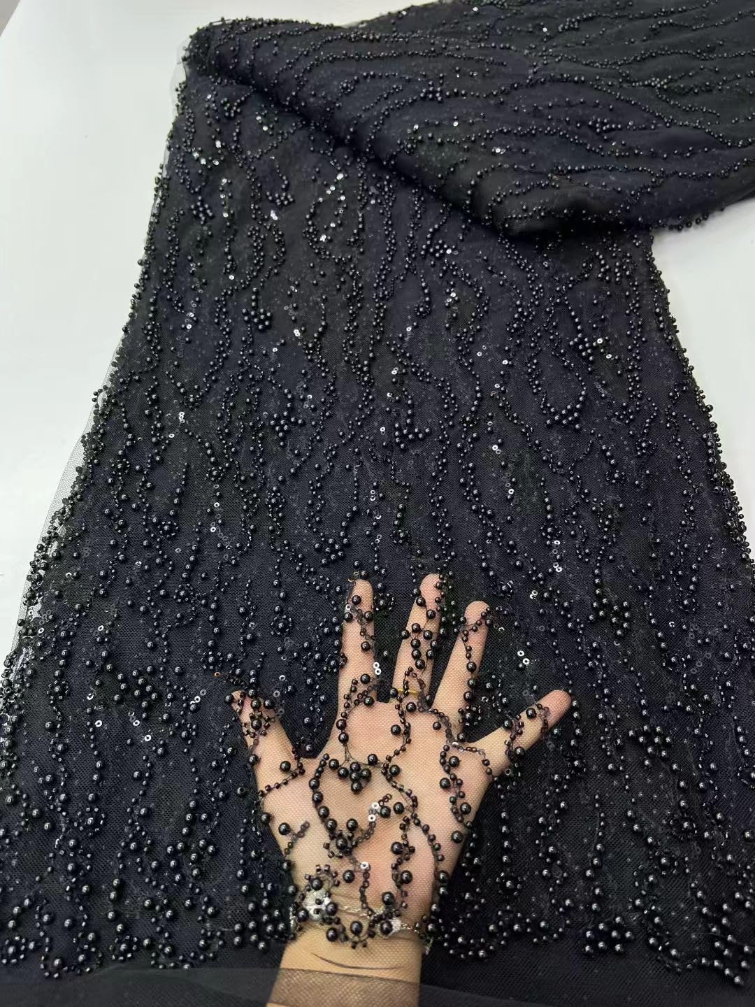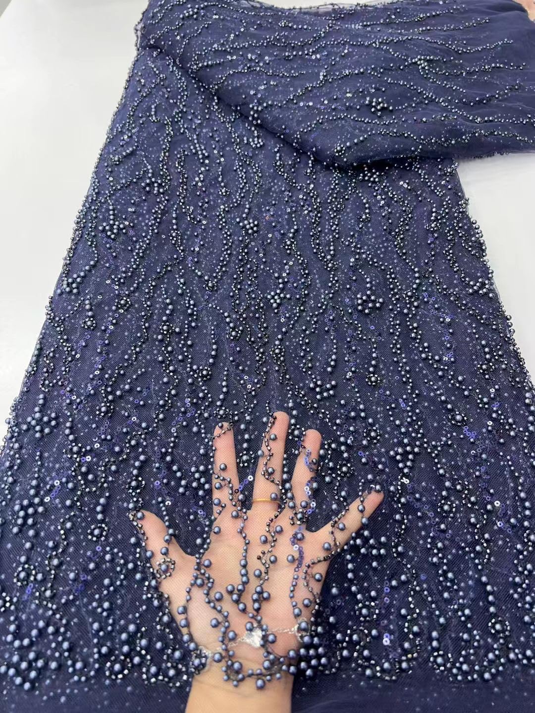 Transform your evening wear creations with this exquisite 5-yard African beaded lace fabric. Meticulously crafted on a French tulle base, this luxurious textile features an intricate arrangement of shimmering sequins and delicate pearls that catch and reflect light with every movement. The heavy beadwork creates a rich, dimensional texture perfect for special occasion garments. Each yard of this premium fabric showcases detailed craftsmanship, making it ideal for creating stunning evening dresses, formal gowns, and haute couture designs. The combination of tulle's airy lightness with ornate embellishments offers both drama and sophistication. This fabric allows fashion designers and seamstresses to create show-stopping pieces that command attention at any formal event. Whether you're crafting a wedding dress, formal gown, or special occasion ensemble, this African lace fabric provides the perfect foundation for unforgettable fashion statements.