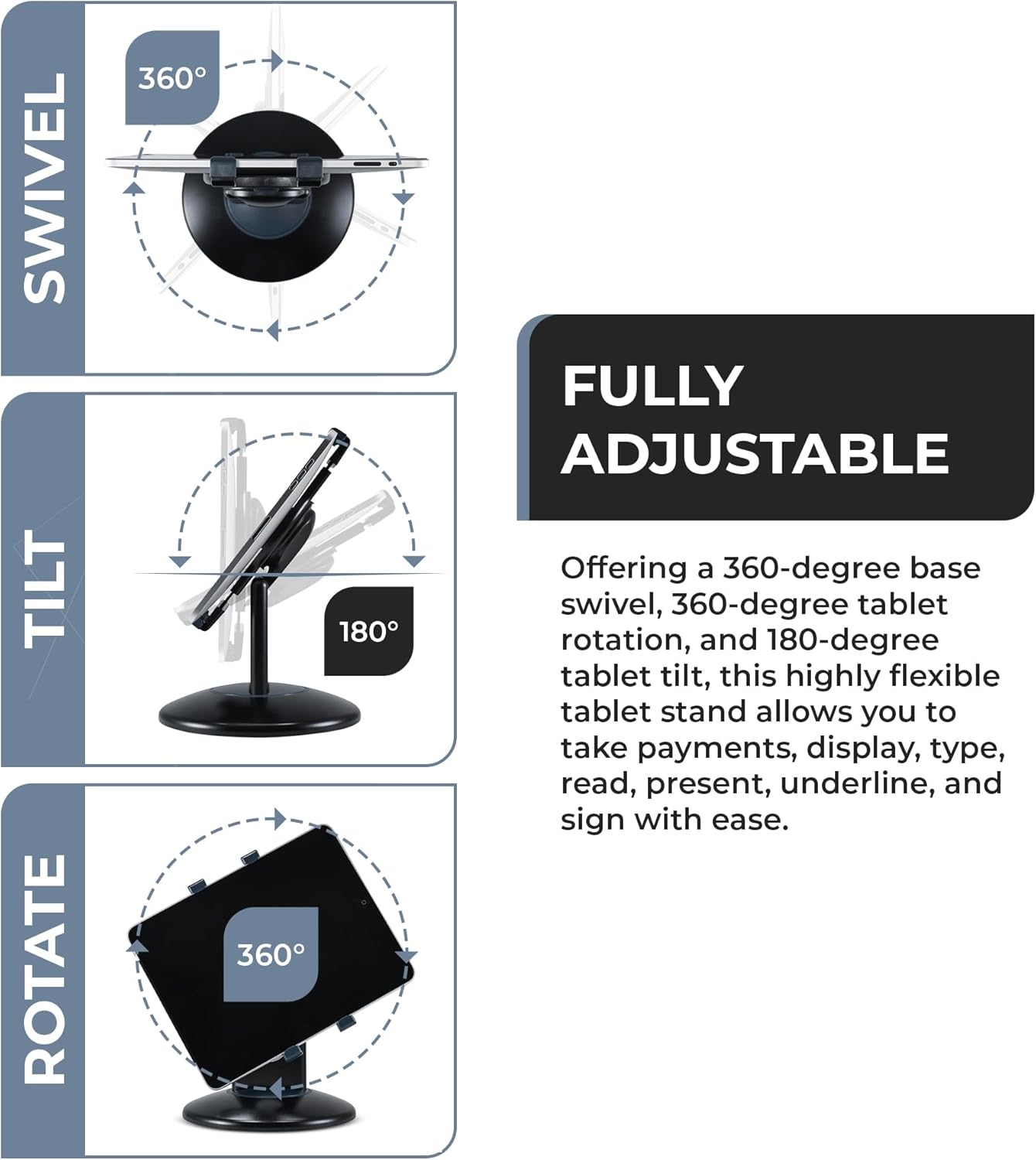 ***Aidata Universal Tablet Station*** With a 360° base swivel, 360° tablet rotation, and 180° tilt capabilities, the Aidata Tablet Stand offers steady support and a seamless experience. This highly flexible tablet stand is sturdy, stable, and solid, with two adjustable grip brackets that are rubber-padded for a secure fit on a wide variety of devices.The folding arm lets you switch seamlessly between displaying, typing, reading, underlining, and signing, providing easy operation and endless versatility. This ergonomic multi-purpose stand simplifies projects, presentations, cash and credit card payments, and screen usage, offering full visibility from any angle. You can easily switch from portrait to landscape mode in seconds and adjust the swivel and tilt for comfortable hands-free use at home, work, or on-the-go. Our durable yet lightweight design can be easily set up, transported, and stored. This stand features a space for your charging cable and access to tablet ports, allowing you to power up your device during use. Its quick attach/detach feature easily adjusts to fit 7.7”-9.6” and 6.6”-7.9” devices. Compatible with iPad, iPad Mini, and a variety of tablets, Aidata Tablet Stands are perfect for use in retail, kiosk, showroom, and home office settings. From bedside notetaking to conference calls and curbside sales, this stand provides incredible speed, adaptability, and efficiency. Please note: Tablet case must measure less than 0.5" thickness Compatible Devices: Apple 12.9 inch iPad Pro, New 10.5 inch iPad Pro, 9.7 inch iPad Pro, iPad Air 2, iPad Mini 4, iPad Mini 3 iPad Mini 2, iPad Air, iPad Mini, iPad 3, iPad 2, iPad, Microsoft Surface Pro, Microsoft Surface Book, Google Pixel C, Google Nexus 9, Samsung Galaxy TabPro S, Galaxy Tab S2, Samsung Galaxy Tab A 7.0 & 8.0 Only, Nvidia Shield Tablet K1, Lenovo Tab3 8 Tablet, LG G Pad 7.0/8.0/8.3
