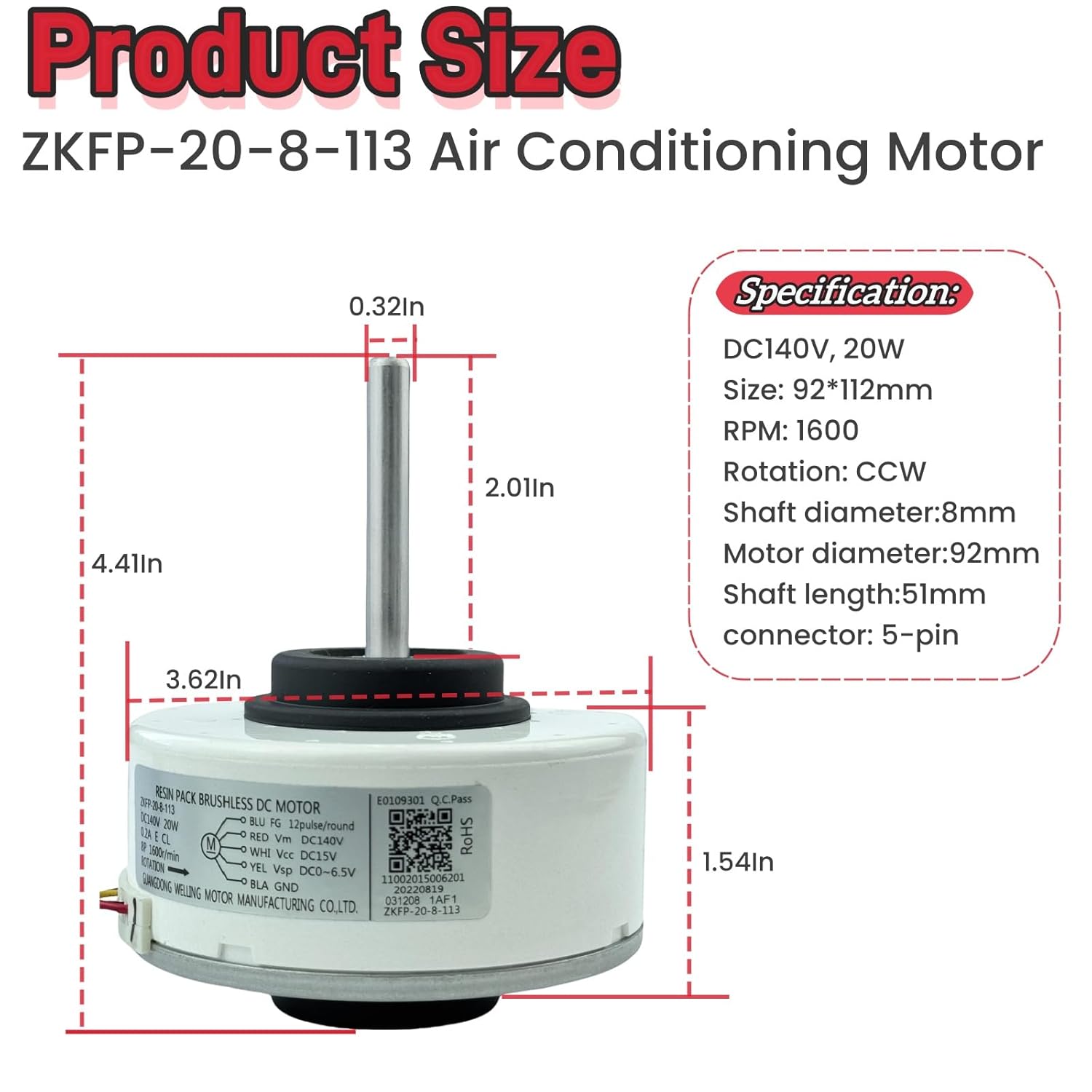 The air conditioner motor fits for model ZKFP-20-8-113 20W Brushless DC Fan Motor The air conditioner motor fits for model ZKFP-20-8-113 Brushless DC Fan Motor of Midea air conditioning specifications: DC140V, 20W Size: 92*112mm RPM: 1600 Rotation: CCW Shaft diameter:8mm Motor diameter:92 mm Shaft length:51mm connector: 5-pin Higher energy efficiency, Low noise, Quick response, High stability Easy and convenient for installation, Please power off your equipment before installation to prevent accidents
