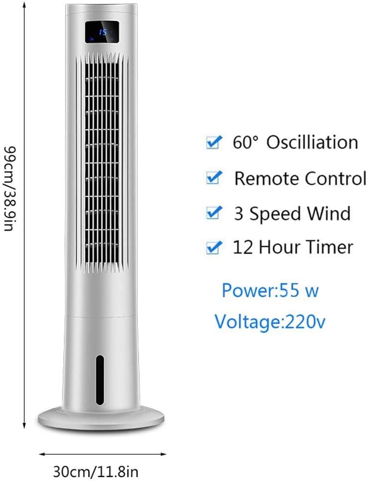 Product name: Cold wind tower fan. Colour: white. Control method: remote control. Gas supply: natural wind/sleep wind/standard wind. Time control function: within 12 hours. Gear position: 3 files Rated voltage: 220 V. Rated power: 55 W. Height: 99 cm Product net weight: 5.8 kg. Note: Manual measurement, product size may have 1-3 cm error, colour may also have errors due to different emitters. . If you are inappropriate or have questions, please contact us in a timely manner. . Warning: Keep out of reach of children unless supervised by an adult. Do not overfill the water tank. Must be kept on a level surface during use; tilting the unit may cause water to leak out of the base. Read the full instruction manual before use. Run time will vary depending on speed setting, room temperature levels, room humidity levels, etc. When not using for extended periods of time, empty the water tank, remove the filter and allow to air dry.