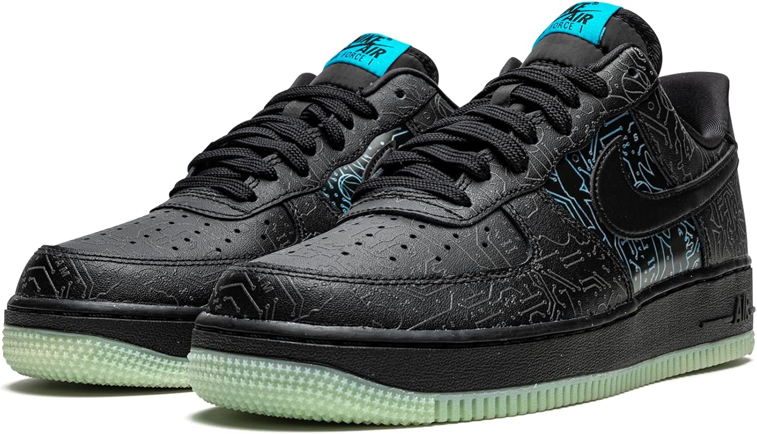 Air Force 1 silhouette, Leather upper with Perforated toe box, Tonal flat cotton laces, All-over Glow-in-the-Dark Space Jam graphics, Embroidered heel tabs, Rubber midsole and outsole. Style: NKDH5354-001, Color: Black, Material: Leather.