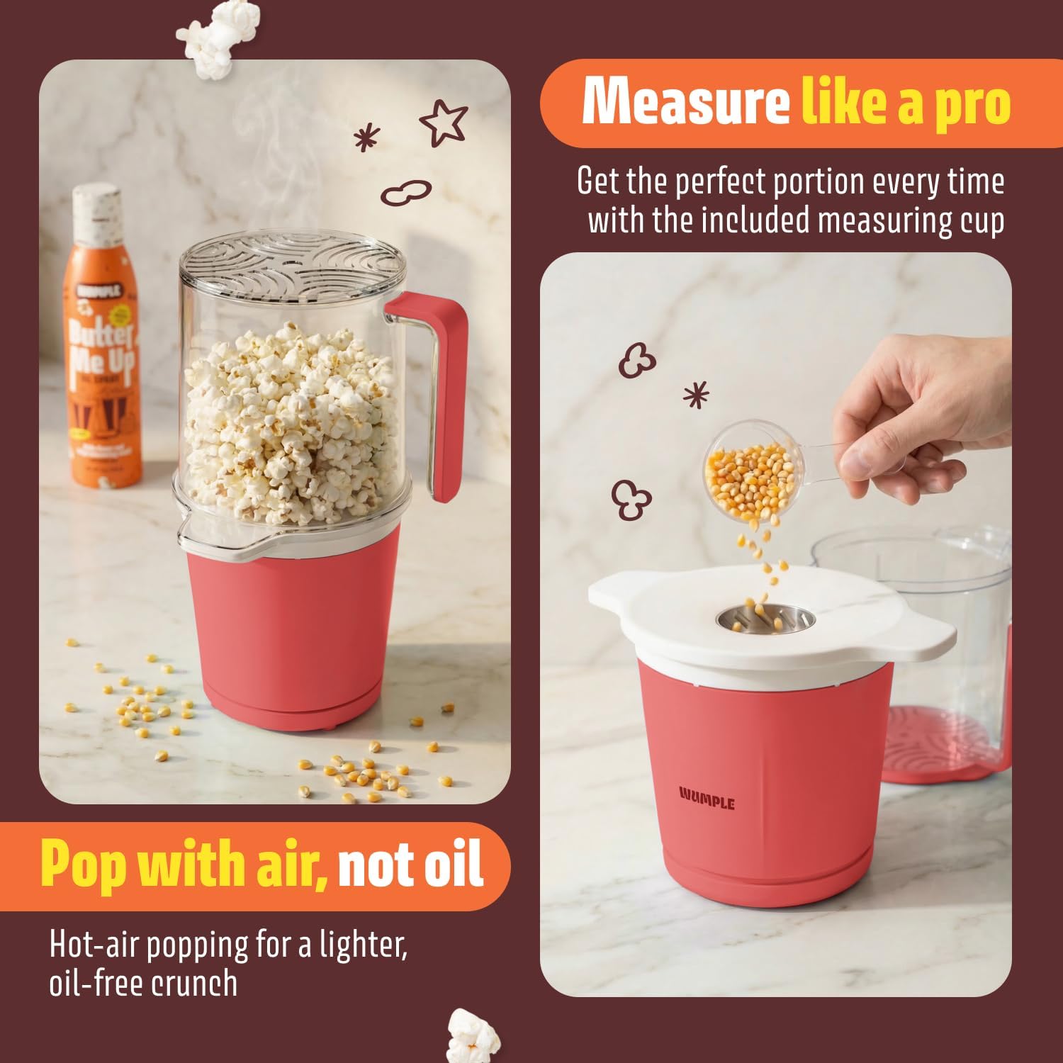 Transform any snack moment into a theater-worthy experience with the Wumple Air Popper Popcorn Machine — a compact, stylish electric popcorn machine engineered for effortless, oil-free popping at home. Powered by a high-performance hot air heating system, this air pop popcorn machine circulates superheated airflow evenly through every kernel, delivering a full batch of light, fluffy popcorn in as little as 3 minutes — with zero oil required. Unlike microwave bags loaded with additives, this air popped popcorn machine uses only hot air to pop kernels, producing a naturally low-calorie snack you can feel good about enjoying every day. The advanced cyclone airflow design minimizes unpopped kernels, so you get maximum yield from every batch with minimal waste — more popcorn, less frustration. Designed for real life, the Wumple popcorn maker features intuitive one-touch operation: simply add kernels, press start, and let the machine handle the rest. The included accessory set — featuring a serving cup with snap-on seasoning lid for shake-and-coat flavoring, a measuring cup for perfect kernel portions, and a recipe book with creative popcorn ideas — adds immediate value right out of the box, making this a truly complete air popcorn maker machine ready to use from day one. Components nest and fold into each other for compact, clutter-free storage between uses. Cleanup is equally effortless, with removable components that wipe clean in seconds and no greasy residue or oil-soaked parts to scrub. The distinctive silhouette makes this hot air popcorn machine a stylish countertop statement that complements any kitchen, dorm room, or home theater setup. Compact enough for tight countertop spaces yet capable enough for movie nights, game days, birthdays, and everyday snacking, this popcorn machine air popper is a versatile choice for families, college students, and entertainers alike.