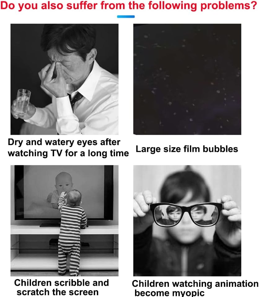Do you have to work in front of the computer for long time every day? Do you often feel pain in your eyes? The main cause is the harmful blue light reflected from the computer.Blue light filter adopts a layered anti-blue light design and multi-layer filtering of blue light, can block harmful blue ray between 380nm to 490nm for wide range HEV protection, Radiation Protection, relieve the fatigue of eyes.Material: Japan Imported P.E.THigh Quality Materials Features: Anti-blue light / Anti-glare / Anti-radiation/ Anti-ultraviolet/ Anti-scratch/ Anti-myopia, Etc. Applicable People: Everyone-Size: 75inch (W1645xH930mm)77inch (W1722xH993mm)82inch (W1831xH1049mm)85inch (W1902xH1089mm)Instructions:1. Clean the screen stains with detergent first, then use the dust remover to remove the screen dust.2. Peel the No. 1 label and slowly peel off about 10 cm.3. Align the two corners of the screen and slowly tear open and fit the screen4. Use the card item to tear the next label and push it until the edge of the corner, and finally tear off the 2nd label.We take care of all after-sales issues, any problems can be contacted and I will take care of them.