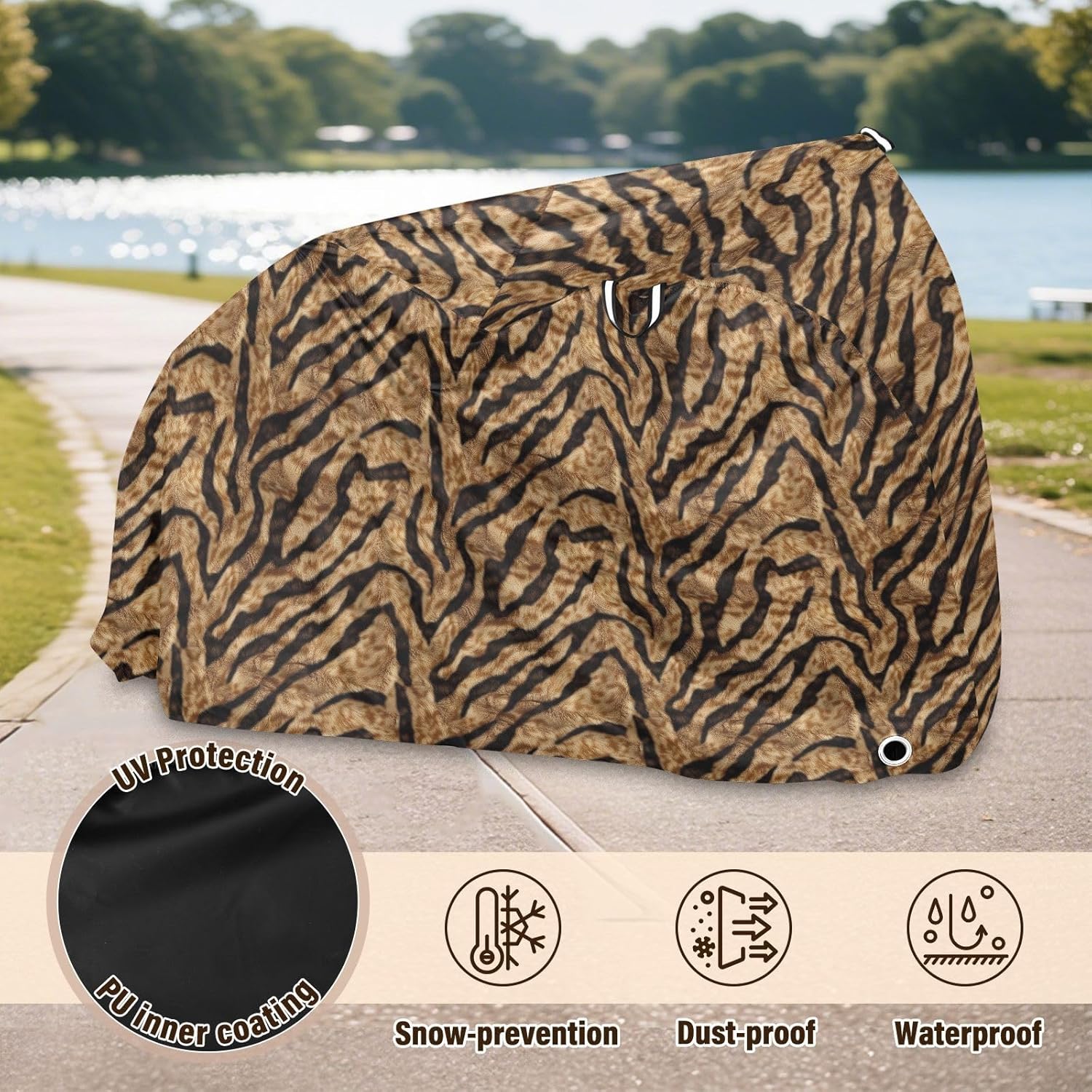 Protect your bicycle in style with our premium bike tarp, engineered for maximum defense against harsh elements. Unlike basic covers, we use specially engineered umbrella waterproof fabric - the same advanced material used in high-end rain umbrellas - delivering superior performance with unique visual appeal. Sun & Heat Defense Our fabric creates a physical cooling barrier that actively lowers your bike's temperature by: Blocking 95%+ harmful UV rays to prevent paint fading Providing exceptional shading & heat insulation (up to 20℉/11℃ reduction vs direct sun) Offering SPF 50+ equivalent protection for sensitive components Rain & Dust Protection Water-repellent coating causes rain to bead and roll off Tightly woven fabric acts as dustproof barrier for long-term storage Prevents moisture buildup with breathable side panels (prevents condensation) User-Focused Design LOCK ACCESS HOLE at front wheel enables secure locking without removing cover ADJUSTABLE BUCKLE STRAP at rear wheel anchors cover during strong winds Reflective safety strips on handles enhance nighttime visibility Ultra-lightweight (23 oz) folds into included pouch Unbeatable Aesthetics Choose from over 1,000 designer patterns - from sleek geometrics to vibrant nature motifs - transforming your bike into a street-style statement while competitors offer only solid colors.