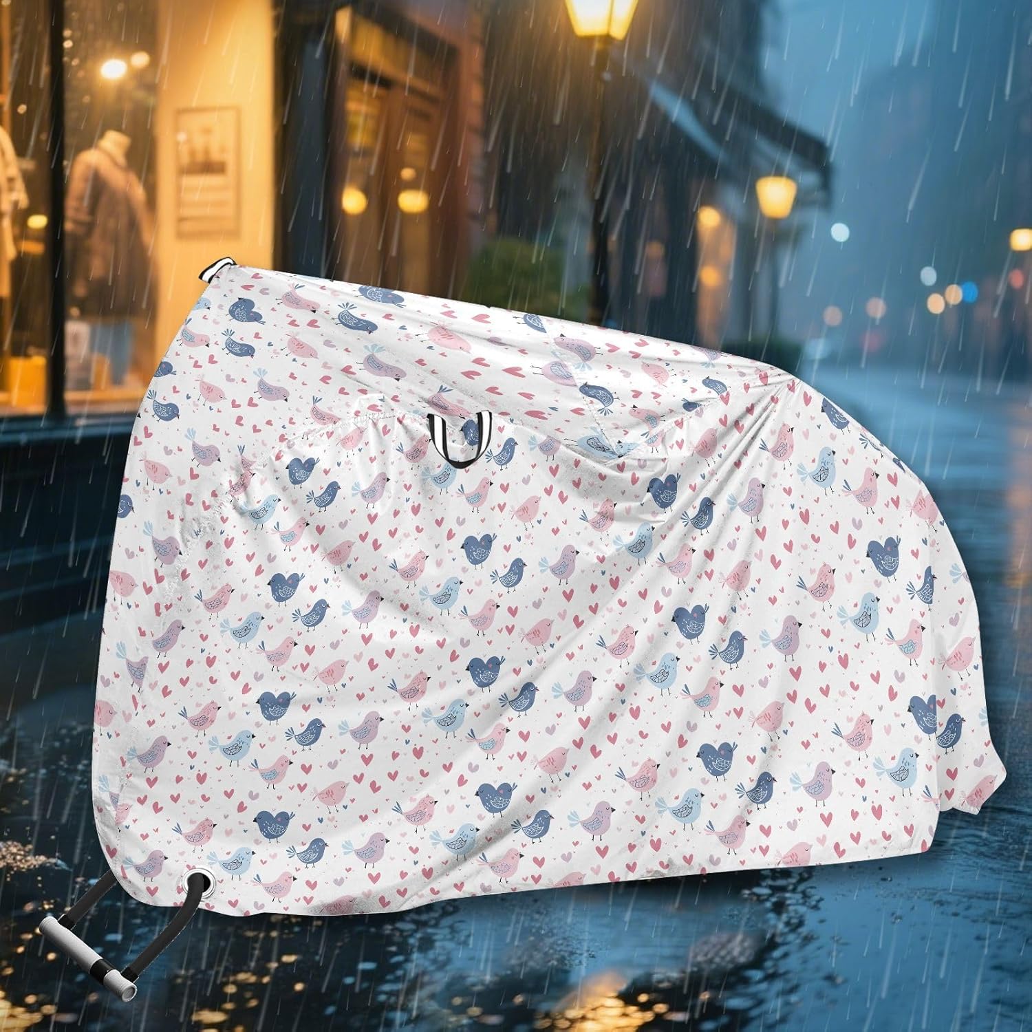 Protect your bicycle in style with our premium bike tarp, engineered for maximum defense against harsh elements. Unlike basic covers, we use specially engineered umbrella waterproof fabric - the same advanced material used in high-end rain umbrellas - delivering superior performance with unique visual appeal. Sun & Heat Defense Our fabric creates a physical cooling barrier that actively lowers your bike's temperature by: Blocking 95%+ harmful UV rays to prevent paint fading Providing exceptional shading & heat insulation (up to 20℉/11℃ reduction vs direct sun) Offering SPF 50+ equivalent protection for sensitive components Rain & Dust Protection Water-repellent coating causes rain to bead and roll off Tightly woven fabric acts as dustproof barrier for long-term storage Prevents moisture buildup with breathable side panels (prevents condensation) User-Focused Design LOCK ACCESS HOLE at front wheel enables secure locking without removing cover ADJUSTABLE BUCKLE STRAP at rear wheel anchors cover during strong winds Reflective safety strips on handles enhance nighttime visibility Ultra-lightweight (23 oz) folds into included pouch Unbeatable Aesthetics Choose from over 1,000 designer patterns - from sleek geometrics to vibrant nature motifs - transforming your bike into a street-style statement while competitors offer only solid colors.