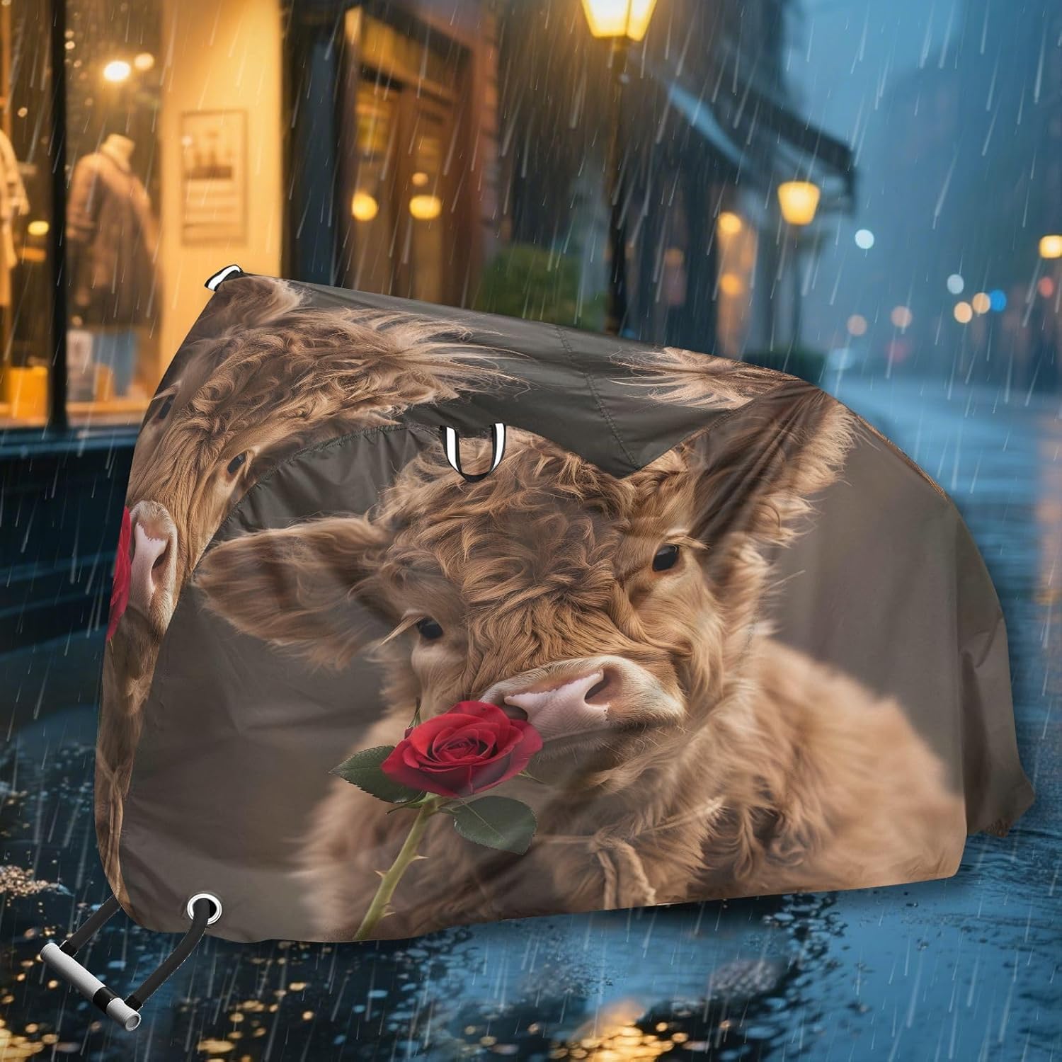Protect your bicycle in style with our premium bike tarp, engineered for maximum defense against harsh elements. Unlike basic covers, we use specially engineered umbrella waterproof fabric - the same advanced material used in high-end rain umbrellas - delivering superior performance with unique visual appeal. Sun & Heat Defense Our fabric creates a physical cooling barrier that actively lowers your bike's temperature by: Blocking 95%+ harmful UV rays to prevent paint fading Providing exceptional shading & heat insulation (up to 20℉/11℃ reduction vs direct sun) Offering SPF 50+ equivalent protection for sensitive components Rain & Dust Protection Water-repellent coating causes rain to bead and roll off Tightly woven fabric acts as dustproof barrier for long-term storage Prevents moisture buildup with breathable side panels (prevents condensation) User-Focused Design LOCK ACCESS HOLE at front wheel enables secure locking without removing cover ADJUSTABLE BUCKLE STRAP at rear wheel anchors cover during strong winds Reflective safety strips on handles enhance nighttime visibility Ultra-lightweight (23 oz) folds into included pouch Unbeatable Aesthetics Choose from over 1,000 designer patterns - from sleek geometrics to vibrant nature motifs - transforming your bike into a street-style statement while competitors offer only solid colors.