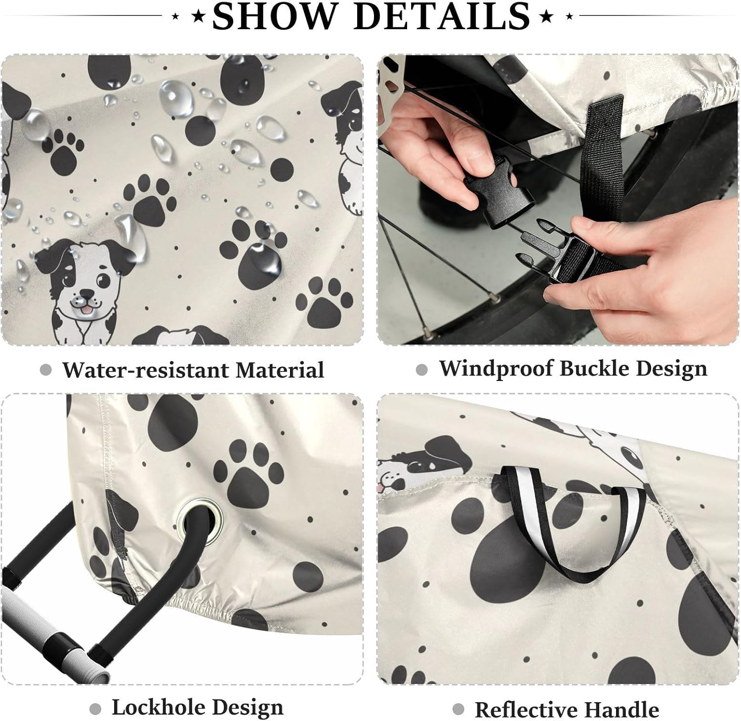 Protect your bicycle in style with our premium bike tarp, engineered for maximum defense against harsh elements. Unlike basic covers, we use specially engineered umbrella waterproof fabric - the same advanced material used in high-end rain umbrellas - delivering superior performance with unique visual appeal. Sun & Heat Defense Our fabric creates a physical cooling barrier that actively lowers your bike's temperature by: Blocking 95%+ harmful UV rays to prevent paint fading Providing exceptional shading & heat insulation (up to 20℉/11℃ reduction vs direct sun) Offering SPF 50+ equivalent protection for sensitive components Rain & Dust Protection Water-repellent coating causes rain to bead and roll off Tightly woven fabric acts as dustproof barrier for long-term storage Prevents moisture buildup with breathable side panels (prevents condensation) User-Focused Design LOCK ACCESS HOLE at front wheel enables secure locking without removing cover ADJUSTABLE BUCKLE STRAP at rear wheel anchors cover during strong winds Reflective safety strips on handles enhance nighttime visibility Ultra-lightweight (23 oz) folds into included pouch Unbeatable Aesthetics Choose from over 1,000 designer patterns - from sleek geometrics to vibrant nature motifs - transforming your bike into a street-style statement while competitors offer only solid colors.