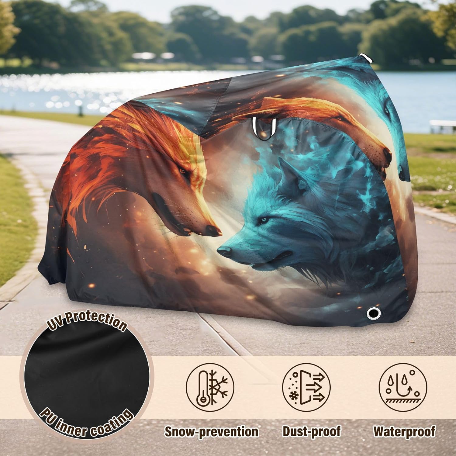 Protect your bicycle in style with our premium bike tarp, engineered for maximum defense against harsh elements. Unlike basic covers, we use specially engineered umbrella waterproof fabric - the same advanced material used in high-end rain umbrellas - delivering superior performance with unique visual appeal. Sun & Heat Defense Our fabric creates a physical cooling barrier that actively lowers your bike's temperature by: Blocking 95%+ harmful UV rays to prevent paint fading Providing exceptional shading & heat insulation (up to 20℉/11℃ reduction vs direct sun) Offering SPF 50+ equivalent protection for sensitive components Rain & Dust Protection Water-repellent coating causes rain to bead and roll off Tightly woven fabric acts as dustproof barrier for long-term storage Prevents moisture buildup with breathable side panels (prevents condensation) User-Focused Design LOCK ACCESS HOLE at front wheel enables secure locking without removing cover ADJUSTABLE BUCKLE STRAP at rear wheel anchors cover during strong winds Reflective safety strips on handles enhance nighttime visibility Ultra-lightweight (23 oz) folds into included pouch Unbeatable Aesthetics Choose from over 1,000 designer patterns - from sleek geometrics to vibrant nature motifs - transforming your bike into a street-style statement while competitors offer only solid colors.
