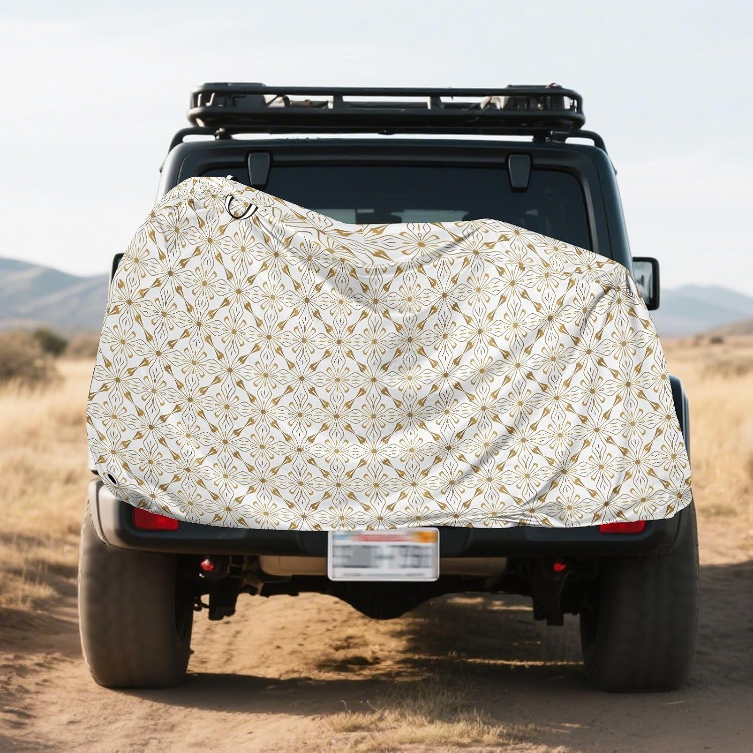 Protect your bicycle in style with our premium bike tarp, engineered for maximum defense against harsh elements. Unlike basic covers, we use specially engineered umbrella waterproof fabric - the same advanced material used in high-end rain umbrellas - delivering superior performance with unique visual appeal. Sun & Heat Defense Our fabric creates a physical cooling barrier that actively lowers your bike's temperature by: Blocking 95%+ harmful UV rays to prevent paint fading Providing exceptional shading & heat insulation (up to 20℉/11℃ reduction vs direct sun) Offering SPF 50+ equivalent protection for sensitive components Rain & Dust Protection Water-repellent coating causes rain to bead and roll off Tightly woven fabric acts as dustproof barrier for long-term storage Prevents moisture buildup with breathable side panels (prevents condensation) User-Focused Design LOCK ACCESS HOLE at front wheel enables secure locking without removing cover ADJUSTABLE BUCKLE STRAP at rear wheel anchors cover during strong winds Reflective safety strips on handles enhance nighttime visibility Ultra-lightweight (23 oz) folds into included pouch Unbeatable Aesthetics Choose from over 1,000 designer patterns - from sleek geometrics to vibrant nature motifs - transforming your bike into a street-style statement while competitors offer only solid colors.