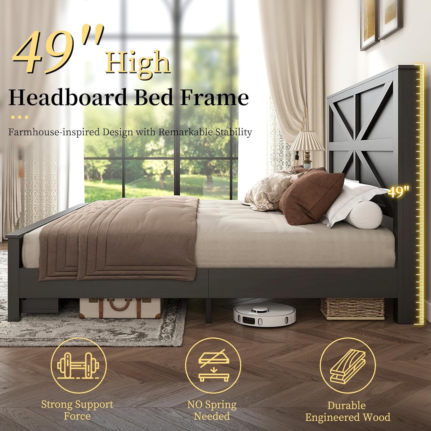 Enhance your bedroom with the Albott Farmhouse Bed Frame with Sliding Barn Door Storage Cabinets.Why choose us?▶Space Saving Design-Sliding Barn Door Storage Cabinets▶Versatile Modern Farmhouse Style▶48.8" High Headboard▶Noise Free, No Squeak▶20 Solid Wood Slats▶Stable Metal Legs Support▶No Box Spring NeededThis storage bed frame combines modern and farmhouse styles, featuring a barn door design on the headboard and footboard with a surface that resembles real wood grain.The footboard of the rustic bed frame includes storage cabinets with sliding barn doors, providing ample space to store bedding and other items, helping you save space in your bedroom.The bed frame with headboard has 48.8-inch high wooden headboard offers extra support and comfort, allowing you to lean back and relax while reading or watching TV in bed.Made from durable engineered wood, this bed frame with storage is more durable and wear-resistant than solid wood, while the wooden slats and metal support ensure a sturdy frame without the need for an additional box spring.Wood bed frame also includes noise-reducing silent cotton, creating a safe and comfortable sleeping environment for your family. Albott farmhouse wooden platform bed frame is the perfect addition to your farmhouse-inspired bedroom!