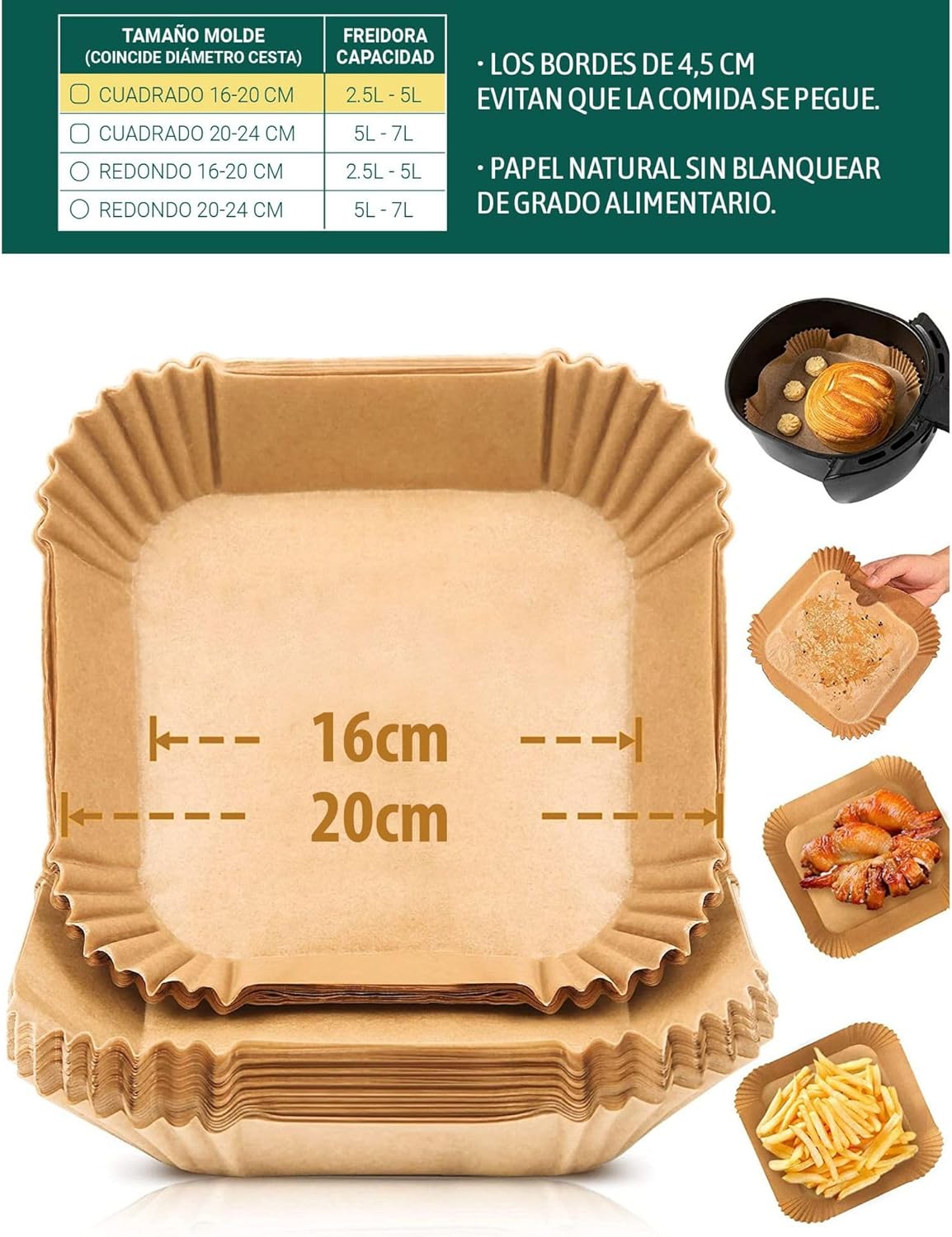 This paper is non-stick, heat-resistant and BPA free, withstanding temperatures up to 230 C without releasing harmful substances. Its design allows for even air circulation, ensuring even cooking in chicken, chips, meats, vegetables and more.
