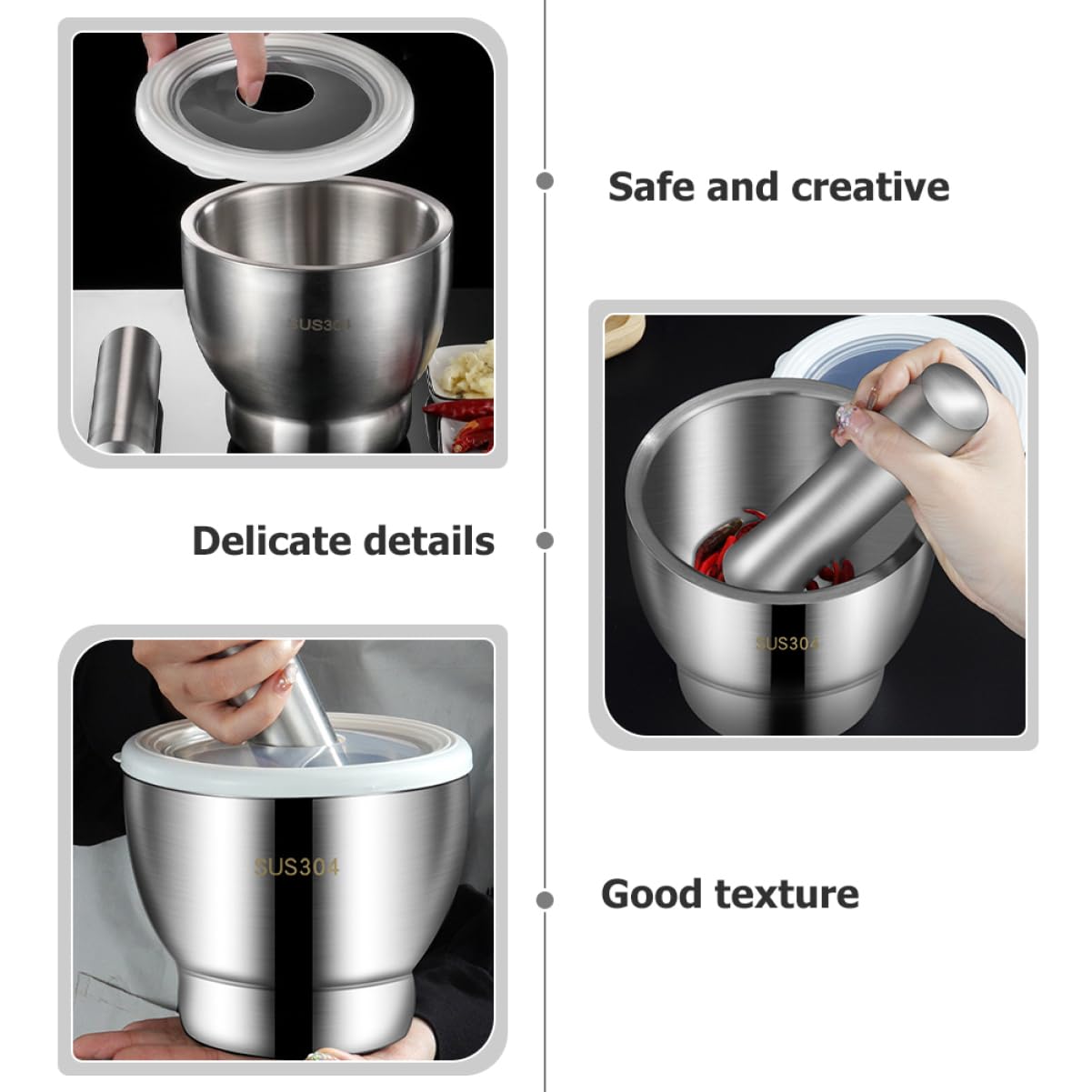 Package Include 1 x set of Characteristics - and stable: Made of solid metal, it feels solid in your hands and sits securely on your kitchen counter. The padding at the bottom makes it more stable crushing bowl. - No mess: The translucent lid allows you to measure your hits and keep the contents in the bowl instead of on the counter stainless steel pestle and. - Food safety: Because stainless steel does not retain residue or residual odor, it only needs to be rinsed thoroughly and. -Material:Stainless steel, PP stainless steel grinding bowl - Strong rust-proof material: pestle and are made of food grade stainless steel. Not only do they resist rust, but they also resist the damage and corrosion of acidic foods metal stone. -Size:10.00X10.00X10.00cm,15.00X3.50X3.00cm/3.93X3.93X3.93in,5.89X1.38X1.18in rock -Color:Silver with lid - Small , which one person can pick up with one hand, is very easy to use and saves energy and pestle large.Goods Descriptionstone The translucent cover not only allows you to gauge your impact, but also prevents flying debris from causing confusion.garlic A non-skid base is easier to use and feels more stable in your hands.and pestle This with a lid can solve this problem.grinding bowl When you crush a pepper, your biggest worry it will splash everywhere and get into your eyes if you are not careful, which is very uncomfortable