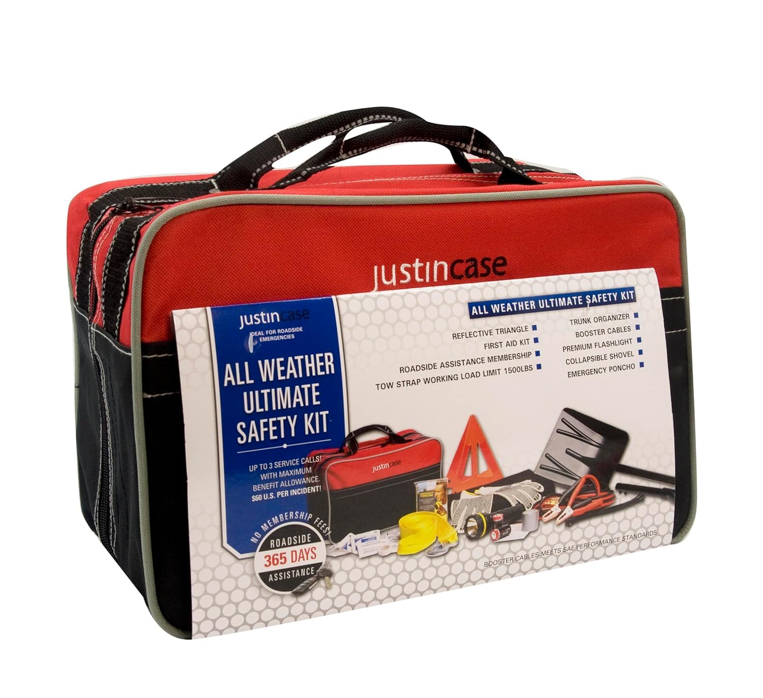 | Included Components | Emergency blanket, Emergency Poncho, Heavy Duty Jumper Cables, Tow Strap, Collapsible Shovel, Knit Gloves, 20 piece first aid kit, Reflective Triangle, 10 LED Headlamp, Three AAA Batteries, Roadside Assistance |