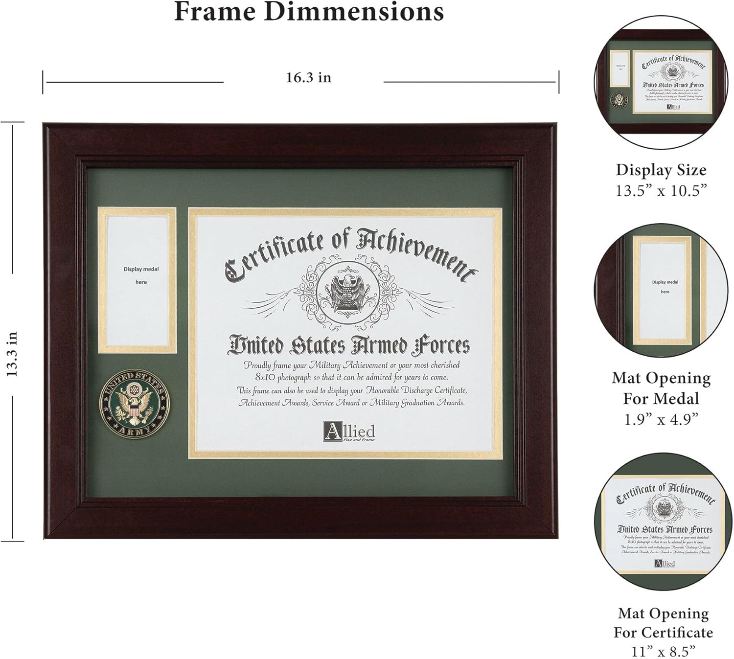 Allied Frame's U.S. Army medal and certificate of achievement frame has a 1-3/4" x 4" medal opening, centered above a United Sates Armed Service Medallion. To the right of the medal opening is an 8" x 10" certificate or award opening. The medal and award openings are bevel-cut into a double layer of matting. The inside layer of matting has an elegant, golden accent. This solid wood, mahogany stained frame is perfect for showcasing any military honors, awards, certificates of achievement or large photographs.
