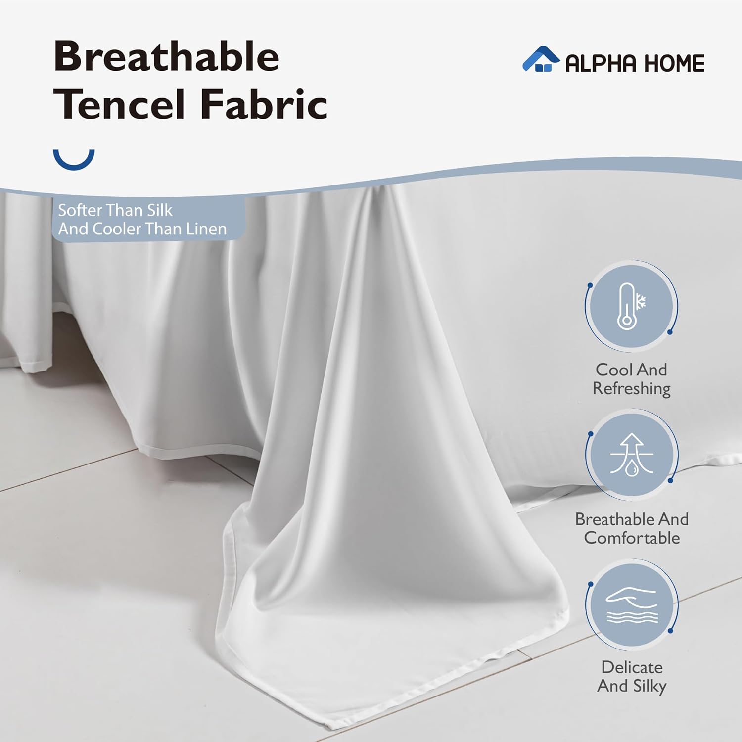 • 【100% TENCEL Lyocell】The sheet set is made of Austrian 100% pure TENCEL Lyocell fibers. Its unique microfiber structure ingeniously regulates the absorption and release of moisture, significantly improving the bedding's breathability and further strengthening the body's natural temperature regulation functions. Compared to traditional cotton fibers, it demonstrates superior moisture absorption properties, making your sleep experience more comfortable and dry. ALPHA HOME queen size sheets set is specially designed for hot sleepers, allowing you to enjoy cool and refreshing sleep even on scorching summer nights.