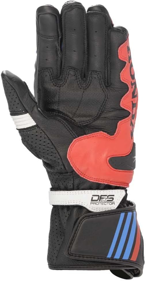 With a fully updated ergonomic shaping and design details, the Honda GP Plus R V2 glove gives the most demanding sports riders protection, feel, flex-ibility and comfort. This innovative and protective leather and multiple-material construction affords a secure and precise fit, and features Alpinestars patented finger-bridge to prevent contortion and finger separation