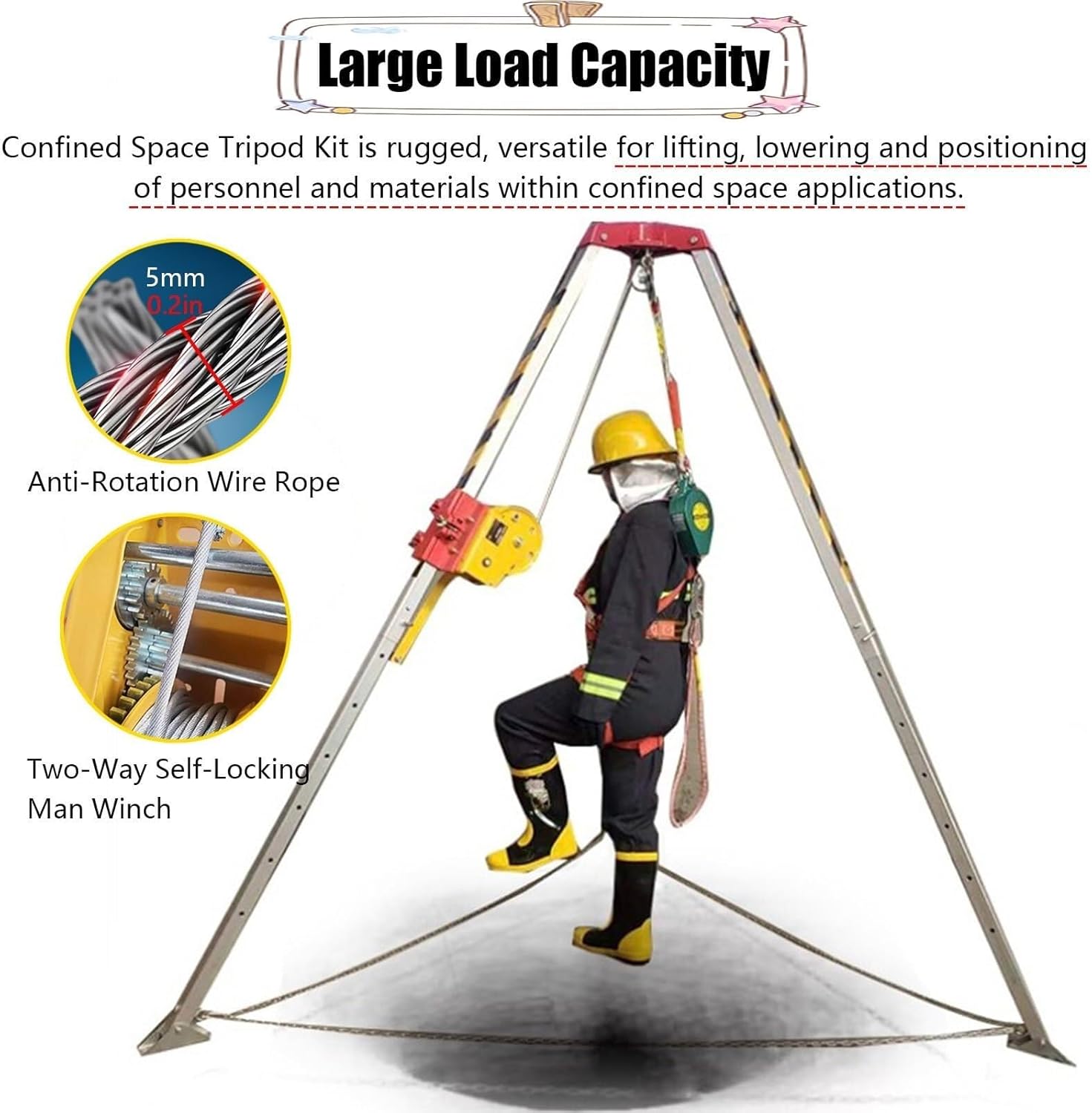 **Emergency Firefighting Rescue Rope System**: In urgent situations, having a dependable rescue and retrieval device is crucial for confined space entry. Our Tripod Kit is expertly crafted to provide assurance and efficiency when it matters most. This versatile fall protection solution not only boosts productivity but also prioritizes user safety across various environments. **Specifications**: - Material: Aluminum - Adjustable Working Height: 1.25m to 2.15m - Man Winch Efficiency: 8:1 - Winch Capacity: 1800 lbs (816.5 kg) - Rated Load: 400 kg (881.8 lbs) - Steel Cable Length: 30 m (98.5 feet) - Steel Cable Diameter: 6 mm (0.24 inch) **Key Features**: Our Tripod Kit boasts a high load capacity, ensuring safety with every use. The top plate, crafted using advanced die-casting technology, offers exceptional durability and longevity. The self-locking mechanism enables effortless adjustments of the winch cable, making it suitable for diverse working conditions. With a maximum height of 2.15m, it adapts seamlessly to your specific needs. The feet base support strap enhances stability, reinforcing the entire system. Additionally, the stainless steel ring protection chain provides flexibility and superior tensile strength, ensuring reliable performance in emergencies. **Package Includes**: 1 x Confined Space Tripod **Precautions**: Please note that manual measurements may yield a 1-3 cm variance in size. While we strive for accurate representation, variations in lighting and equipment can affect the appearance of the product in images. The actual product should be considered the definitive reference. Choose our Tripod Kit for your emergency firefighting and rescue operations. Experience the assurance that comes from a reliable system designed with your safety and efficiency at the forefront. Whether you are a first responder or part of a safety team, our Tripod Kit is an essential tool for effective emergency management.