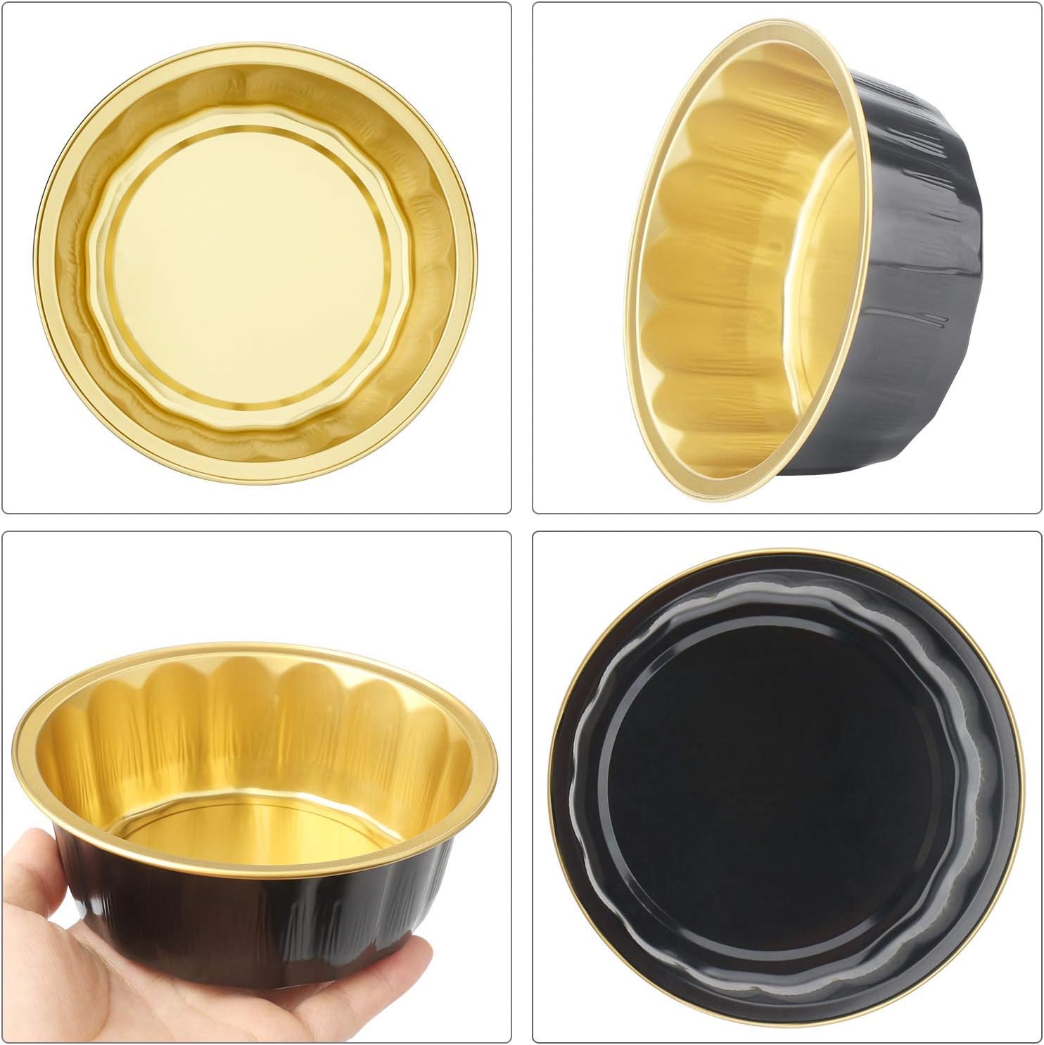 Features:★ High quality aluminum foil material, faster heat conduction and lightweight.★ Our aluminum foil cups can be used on fire, reduce the consumption of energy(Do not put the empty cups on the fire).★ It is a baking cup and also a beautiful packing, do not need to demold and reduce loss.Package included:100 x Beasea aluminum foil cups black gold100 x Beasea plastic cup lidAbout BeaseaBeasea are working for research and development of silicone molds, aluminum foil cups and other home kitchen supplements for many years.We are striving to make high quality products and provide sincere service to every our customers.