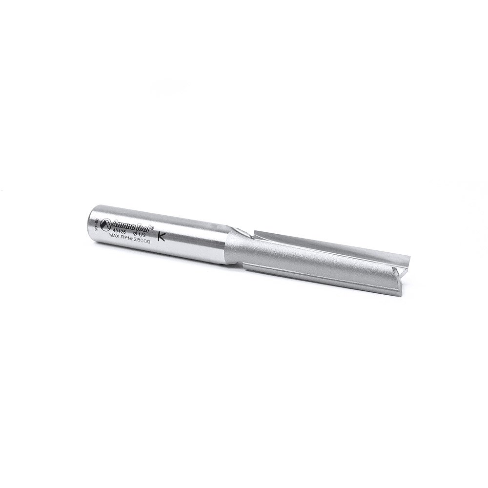 Product Description Use a Two-Flute bit where fine finish is paramount. Two flutes balance the bit, eliminating vibration that degrades the cut finish. Two cuts per revolution yield a smooth surface, but feed rate is slightly reduced, #45426, direction: down-cut, diameter (D): 1/2, cut depth (a): 1/4, angle (a°): 0°, radius, r): .015 (.4mm), cutting height (B): 2, shank (D): 1/2, overall length (L): 4-1/4, 45426 carbide Tipped straight plunge 1/2 dia x 2 inch x 1/2 shank From the Manufacturer Since 1972, Amana Tool has been producing router bits and has become the global leader in its field. In fact, the company was the first manufacturer to produce router bits according to the Holz BG German standard for safety and quality. This standard contains rules that determine the structure and quality of the tool's material in order to create the safest environment for the user. From its beginning, Amana Tool has always used the highest quality materials, and its tools are produced using unique technologies, a majority of which were developed and built by the company's engineers following decades of testing and experience. For example, Amana Tool uses carbon alloy steel for its router bits that contains vanadium particles. This improves the structural integrity of the steel and prevents corrosion and defects in the internal structure of the material that can lead to cracks and breaks. High-tech machinery processes the carbon alloy steel to manufacture the router bodies in a single clamping. This yields router bits with superior balance, centricity, precision and symmetry. A-Max Extended life router bits are extra strong, to last extra long. With new superior geometric design, and new advanced automatic grinding technology that improves the carbide's resistance to wear, you will get super clean cuts and a 200% longer lifetime even when working with abrasive materials.