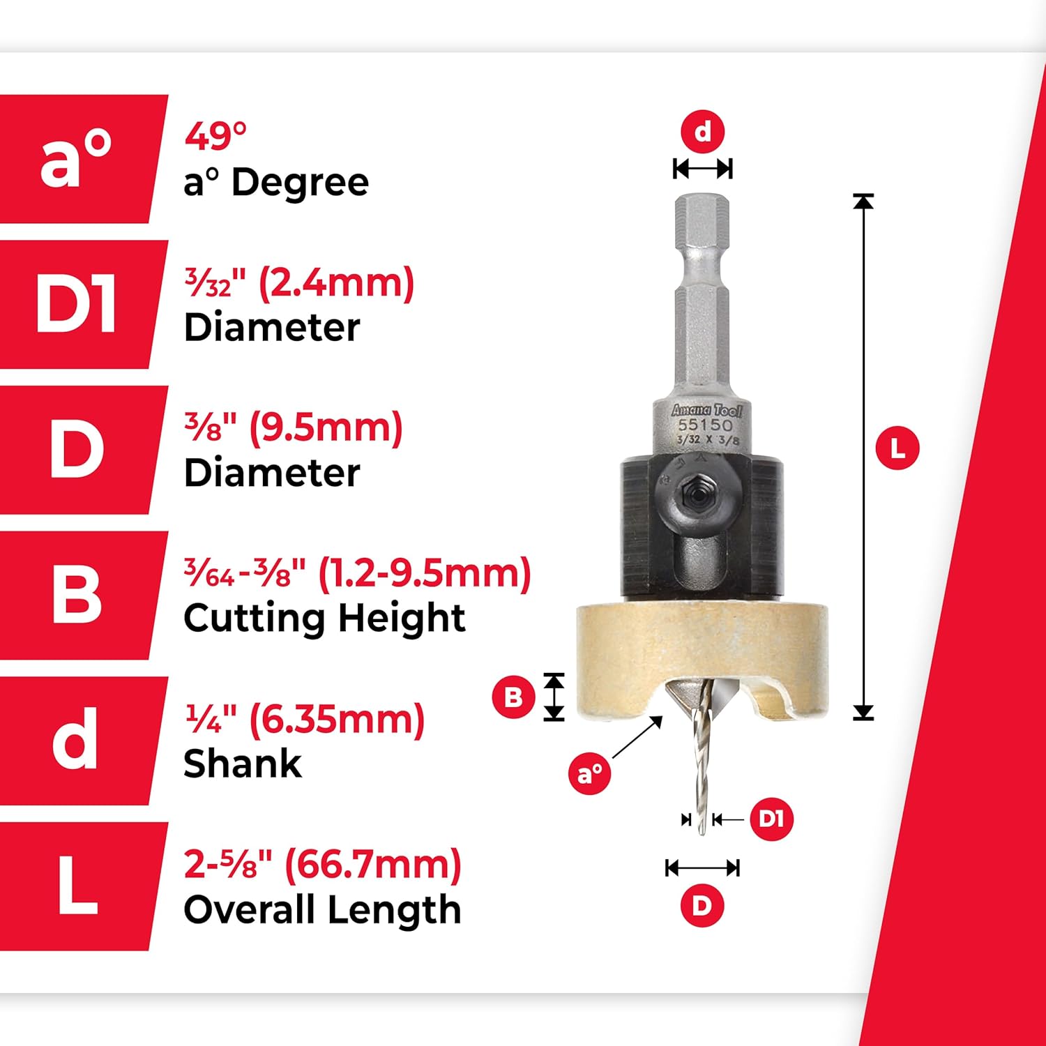 Experience precision and efficiency with the Amana Tool Countersink Bit including a slow spiral, High-Speed-Steel (HSS) M2 fully ground drill bit. This countersink drill bit set for wood, aluminum, and composites is designed for long-lasting performance. Engineered with an adjustable, low friction revolving depth-stop with a no-thrust ball bearing, this tool allows for quick and easy countersink depth adjustment without scratching or burning the work surface. The large openings around the collar ensure effective chip evacuation during use, keeping your workspace clean and your bit running cool. This countersink set enables users to drill a pilot hole and tapered countersink in one step. Please note: When drilling aluminum/non-ferrous materials, for optimal performance and extended tool life use lubricant or air cooling. Make sure the material is fixed and the drill is stable during drilling. Disconnect from any vacuum system. Using Low RPM is recommended.