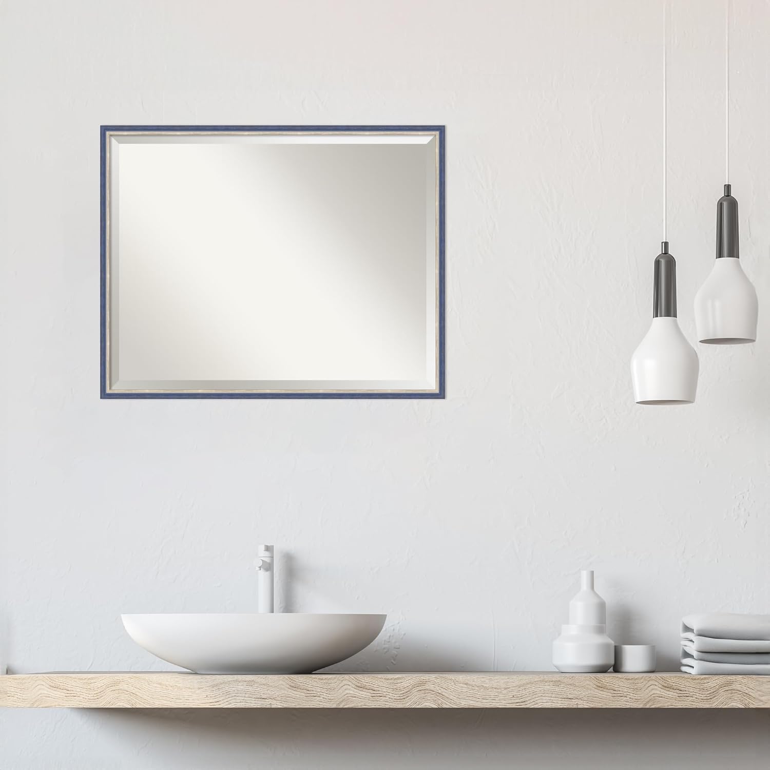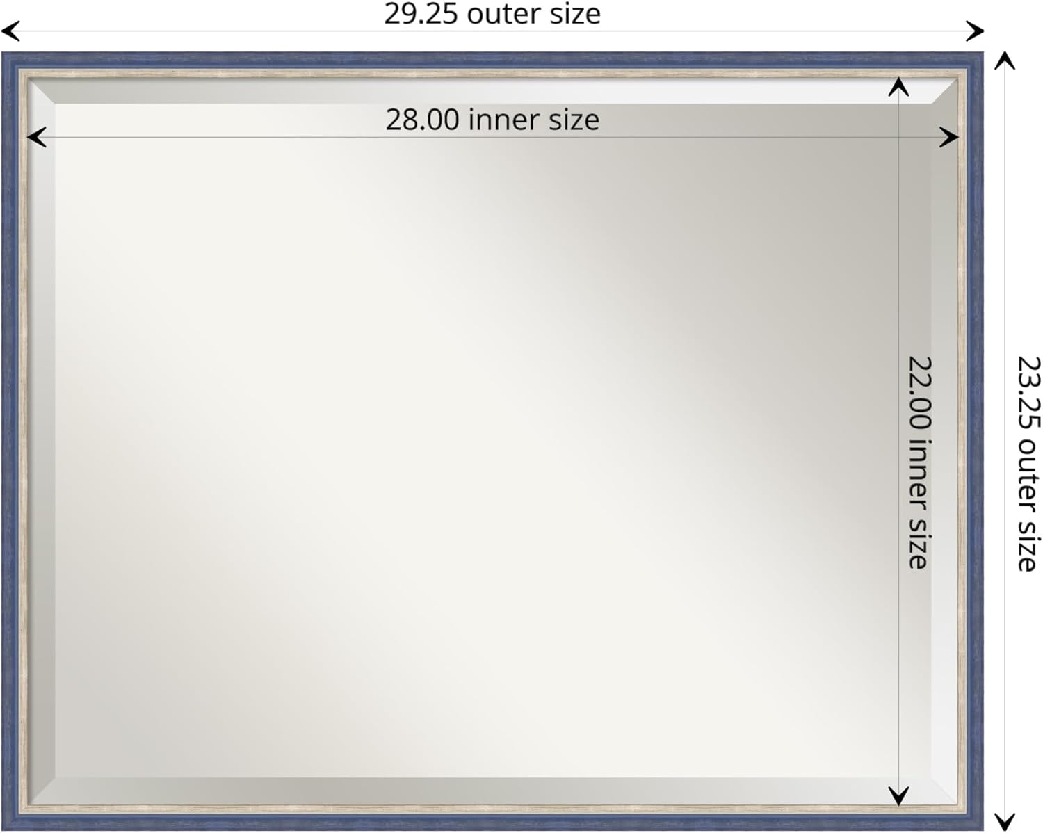 PRODUCT: Amanti Art Beveled Wood Wall Mirror; OUTER SIZE: Exactly 29.25 x 23.25 inches; FRAME: Theo Blue Narrow; FRAME FINISH: Satin; FRAME COLOR: Blue. The Theo Blue Narrow frame is a faintly distressed curved satin finish navy blue frame that is tallest at the outer edge and tapers down to a lightly lined silver inner lip. Give your home or office the finishing touch with this 100% real wood-framed wall mirror. Individually made using traditional custom framing techniques, it has the quality you would expect from your local frame shop. It holds its value with premium finishing that can be appreciated up close. Because of our attention to detail and focus on artistry, architects, interior designers, and homeowners alike choose this mirror to create beautiful living spaces.