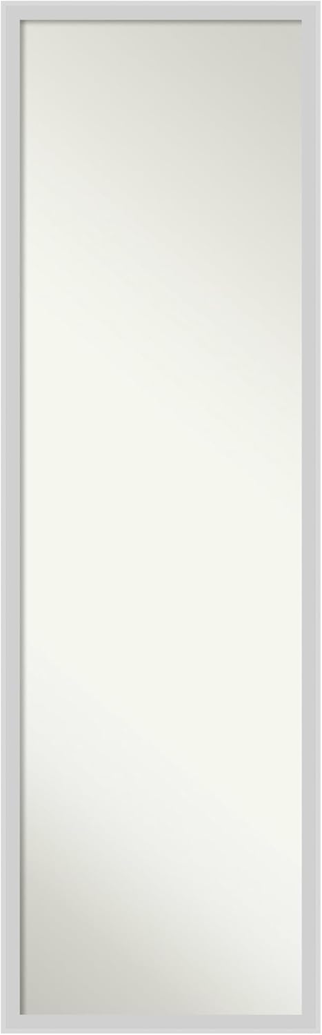 PRODUCT: Amanti Art 100% real wood Non-Beveled Door Mirror; FRAME: Low Luster Silver; FRAME FINISH: Glossy; FRAME COLOR: Silver; OUTER SIZE: Exactly 16.75 x 50.75 inches. The Low Luster Silver frame is a silver frame with a flat surface and smooth, slightly shiny finish. This high-quality, 100% real wood, full-length mirror complements your decor without the need for unsightly over-the-door brackets. Individually made using traditional custom framing techniques, it has the quality you would expect from your local frame shop. It holds its value with premium finishing that can be appreciated up close. Our On The Door Mirror has two hooks to hang directly on your door or wall without additional anchors or brackets. Hang it on the back of a closet, bedroom or bathroom door, or wall as a standard full-length mirror. Because of our attention to detail and focus on artistry, architects, interior designers, and homeowners alike choose this mirror to create beautiful living spaces.