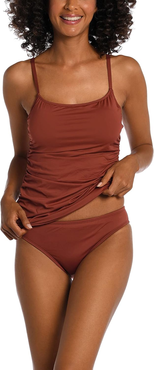 Sleek and easy does it in this shape-perfecting tankini set by Amavi. Evoking ballerina vibes, the delicate scoopneck tank is designed to flatter with every detail. Shirred fabric visibly slims your tummy while built-in underwire, removable cups and adjustable straps keep you feeling lifted and supported. With moderate coverage and a mid-rise fit, basic hipster bottoms are the perfect minimalist anchor.