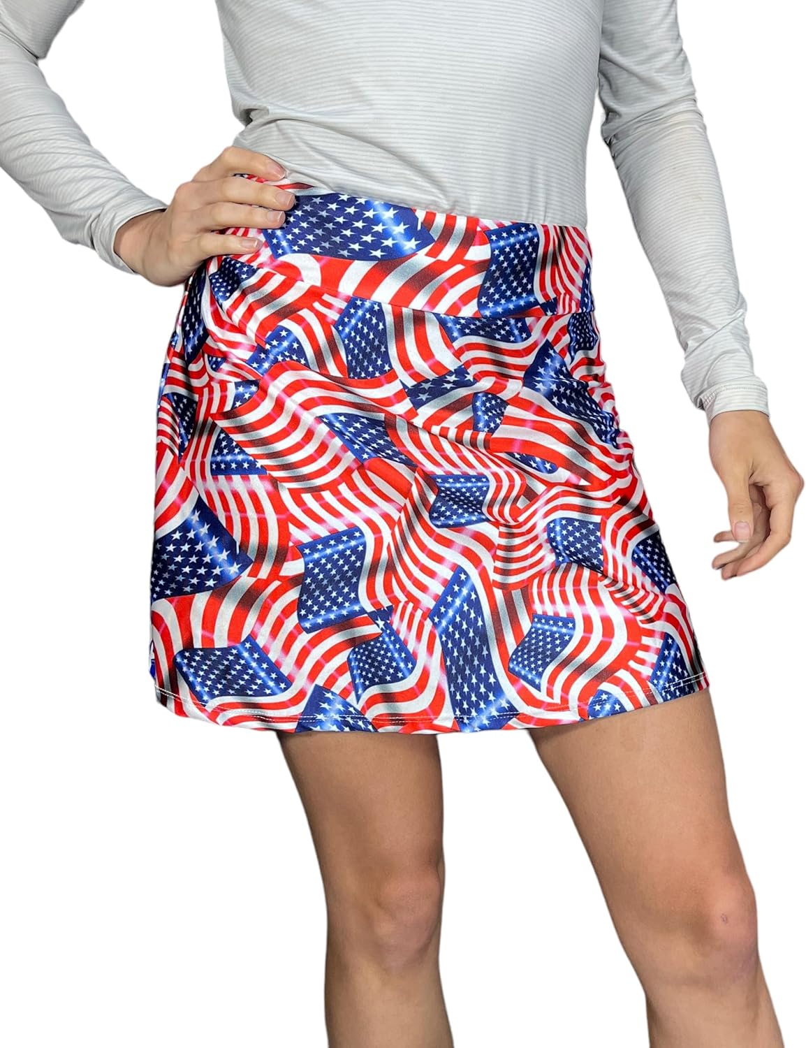 Step up your game in this fun USA flag patriotic print athletic skort with built in compression shorts and pocket. This golf, tennis, running or sports skirt is flutter-style in flag print with stars in back and allows for plenty of movement, made of high quality performance spandex. The compression shorts are uniquely designed to be incredibly comfortable and won't ride up during activity. The 2 pockets are positioned on the sides of the shorts, and will fit your phone, keys, ID, etc. The attached shorts are white. *Please see size chart in images above for standard skirt length, shorts inseam length, and sizing.