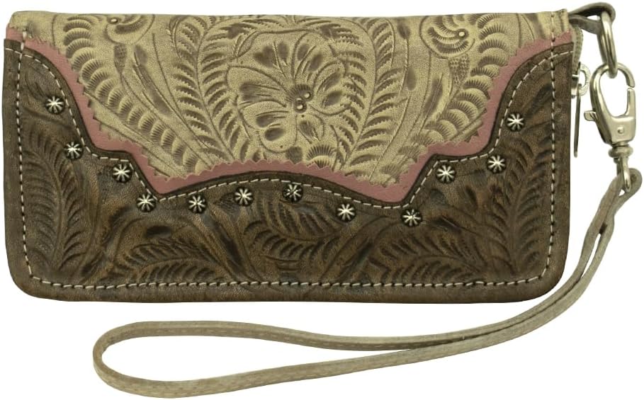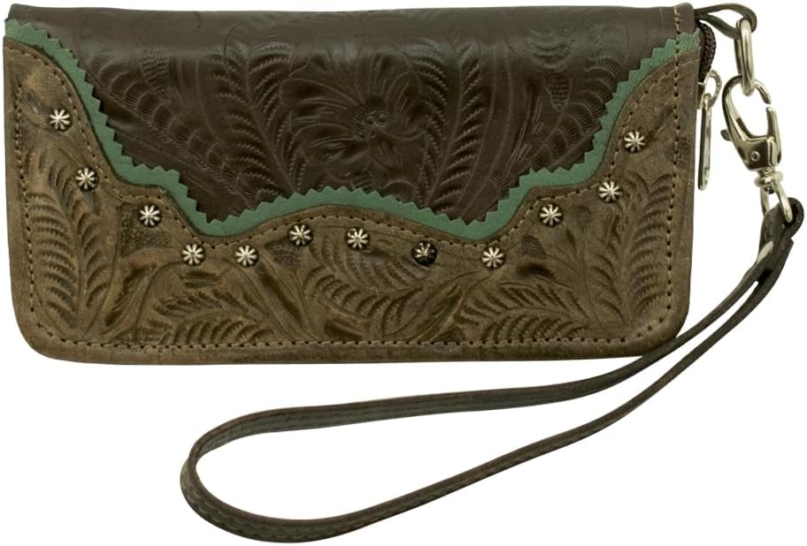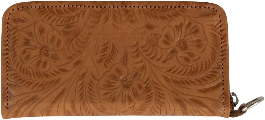 The Saddle Ridge Ladies Zip Around Wallet is crafted from 100% genuine full grain leather, hand tooled and hand stained by skilled artisans using traditional Western leather working techniques. The exterior features detailed tooling, contrasting leather colors, antique spots, and scalloped trim for a rich, dimensional Western look. The interior is fully lined in genuine leather, offering durability and a premium feel. Natural variations in the hand dyed cowhide ensure that every wallet is completely unique. The zip around design opens to a full leather interior with 12 card slots including 1 clear ID window, 2 cash/slip pockets, 2 gusseted compartments, and a zippered coin pocket—providing organized storage for cards, cash, receipts, and small essentials. A detachable leather wrist strap adds convenient carry options for everyday use. Measuring 8 x 4", this silhouette offers generous capacity while maintaining a slim, elegant profile. Every American West piece is handcrafted from hand dyed 100% leather cowhide, showcasing the artistry and heritage the brand has been known for since 1986.