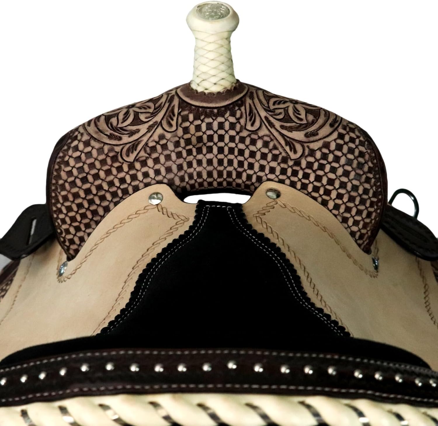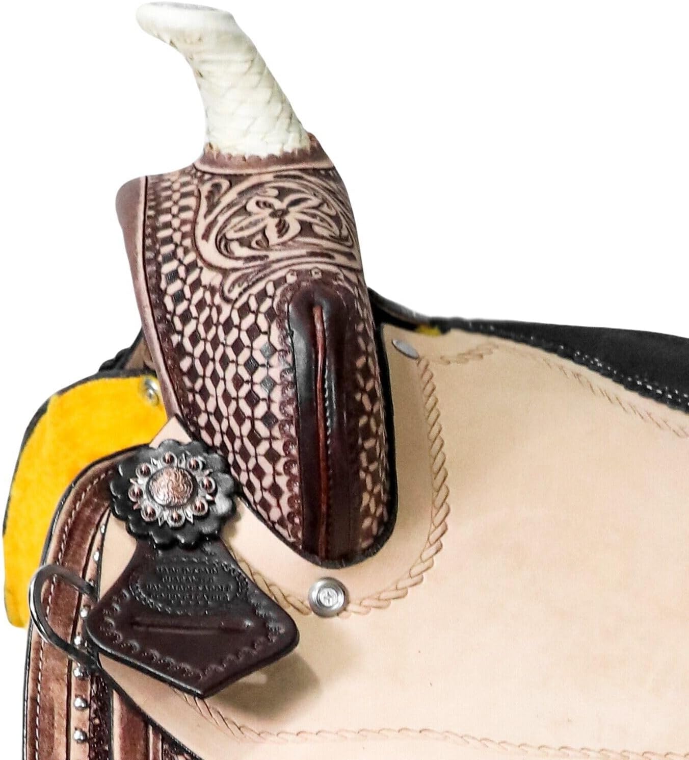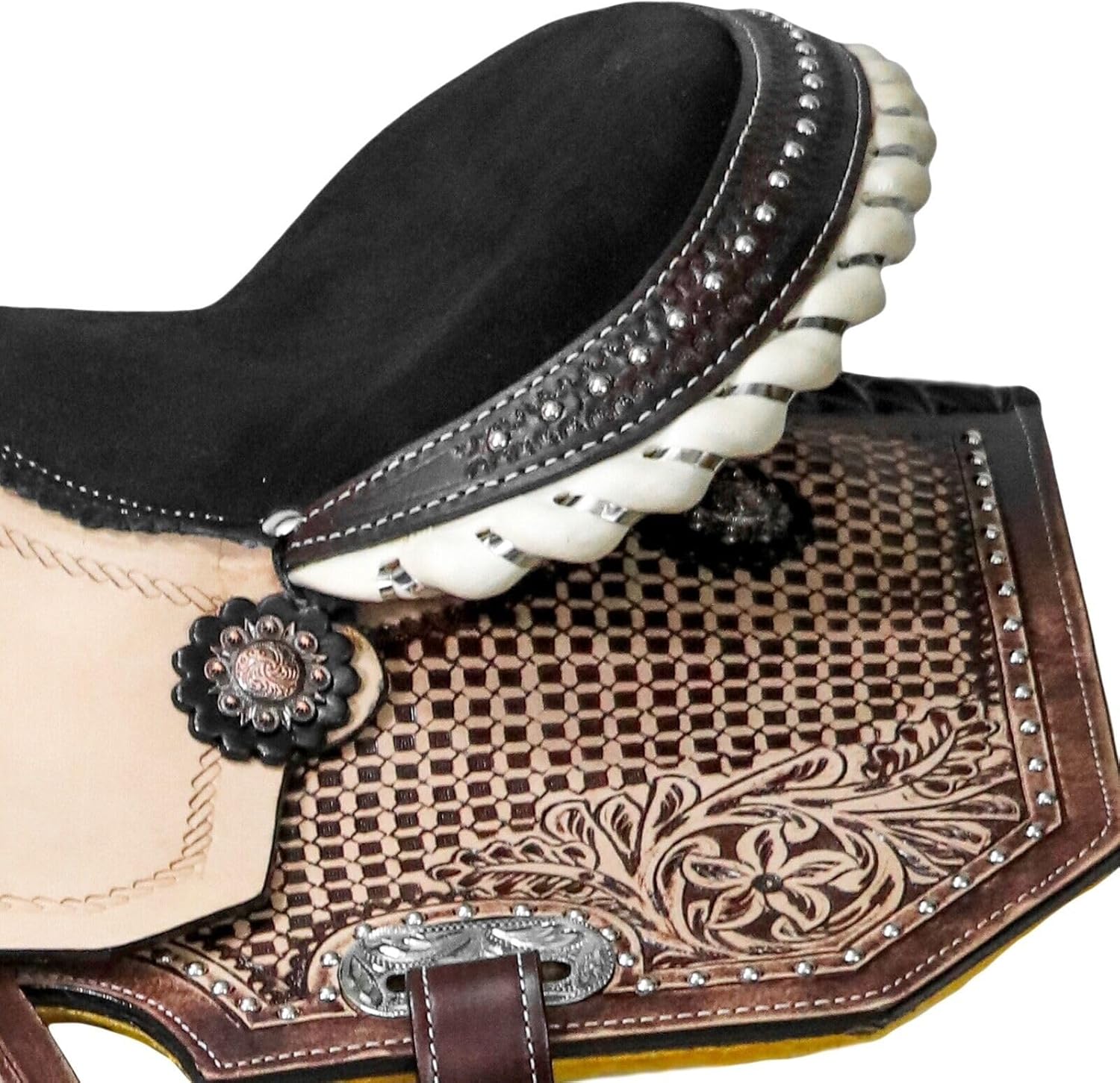 Experience unmatched comfort and control with the Fiorwyn Western Horse Saddle Set—crafted for riders who value premium quality, performance, and classic Western elegance. Designed for trail, pleasure, and training rides, it ensures balance, durability, and style for both horse and rider.The flex tree structure adapts to your horse’s natural movement, offering superior comfort and reducing pressure points. A soft padded ergonomic seat promotes proper posture and stability, while the shock-absorbing build allows for smoother rides even on long trails.Handcrafted from premium beige & brown tooled leather with reinforced stitchingFlexible tree design enhances horse comfort and rider balanceComplete with headstall, reins, and breast collar for a coordinated lookPerfect for trail, ranch, arena, and pleasure ridingAvailable in seat sizes 8" to 17" for all age groups and riding levelsBuilt for lasting use, the Fiorwyn Western Saddle combines timeless floral tooling with functionality and resilience. Whether training or exploring the outdoors, this saddle delivers the perfect blend of comfort, control, and Western craftsmanship.