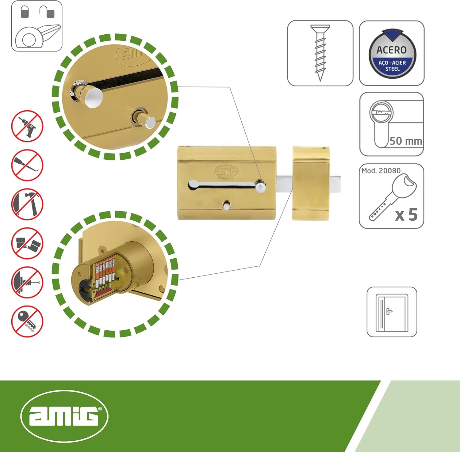 High security latch type overlap bolt that features magnetic trim, anti-drill plate, anti-lever side support and anti-bumping and anti-printing system. Protected against pick and very resistant to extractions and breakages. As for its details, its measurements are: 98 x 77 mm. Cylinder length: 50 mm. With property card, 5 coded point keys (model 20080 AMIG) and screws for installation. Material: steel, used for its service life and resistance to rubbing, rust and corrosion. About its main uses, with widely used to reinforce the security of the home entrance and to place as a latch or bolt on doors of bedrooms, bathrooms, offices or any other room. Very useful also for fixing in storage rooms, gates or fences. To know a little more about us, at AMIG we have been manufacturing and distributing products of high quality and reliability of locksmith, DIY, hardware, hardware, gardening, household and household for more than 80 years.